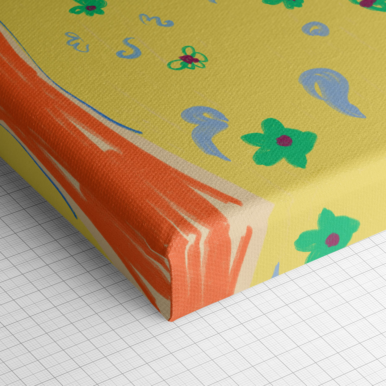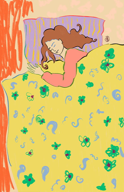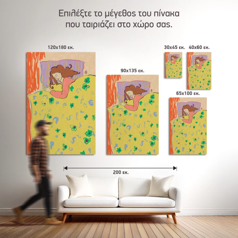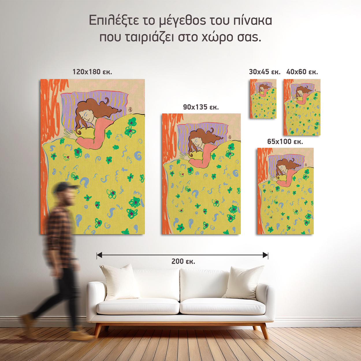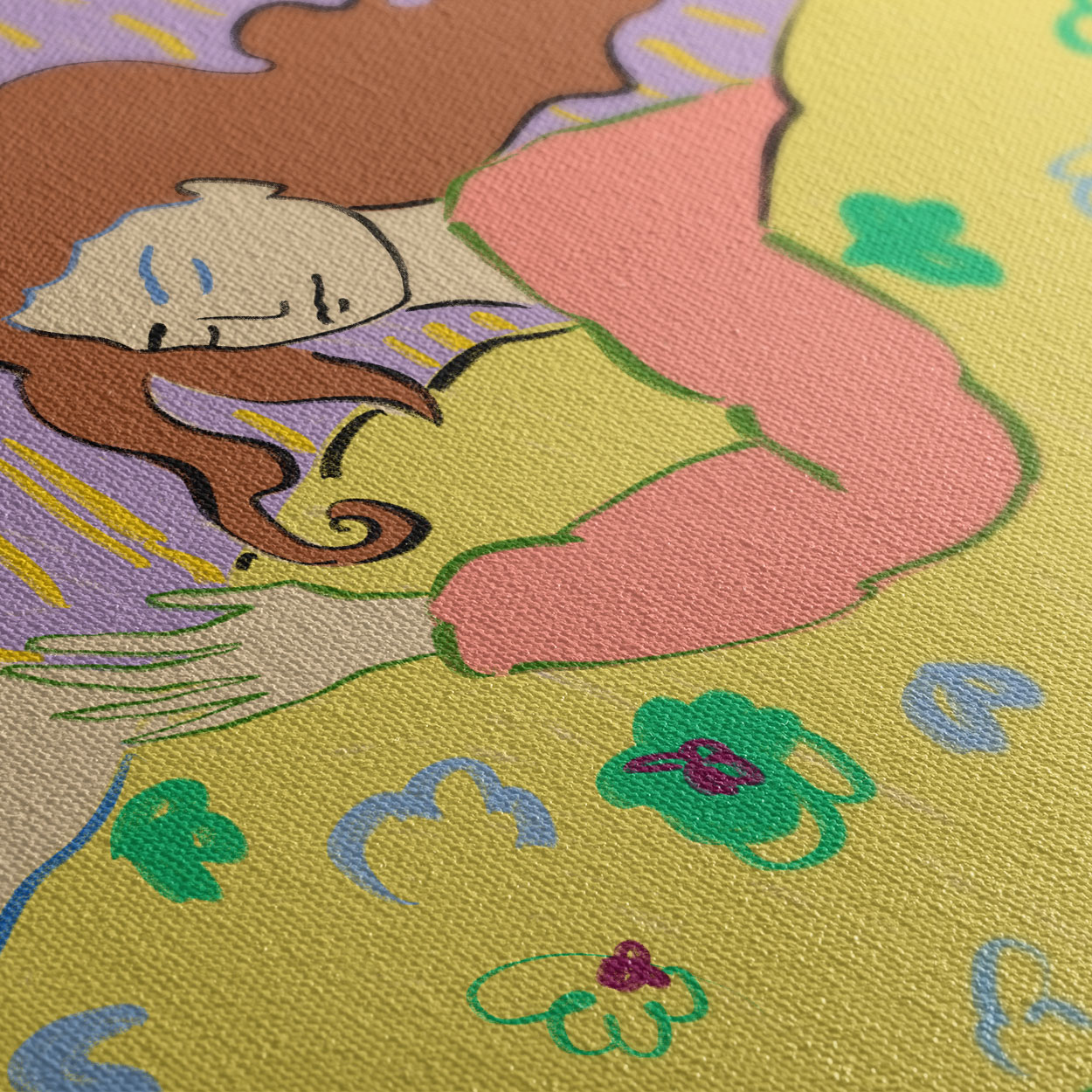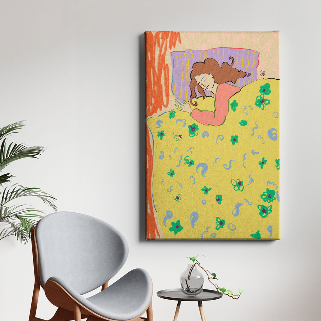 Ένας τρυφερός πίνακας που αποτυπώνει την οικεία στιγμή του ύπνου: η φιγούρα μιας γυναίκας σε χαλαρή πόζα κάτω από μια πράσινη κουβέρτα με λουλούδια, σε παλέτα ζεστών και απαλών τόνων. Οι παιχνιδιάρικες διακοσμητικές λεπτομέρειες δημιουργούν αίσθηση ζεστασιάς και ρετρό γοητείας. Κατάλληλο για δωμάτια ύπνου, παιδικά δωμάτια ή ως δώρο με συναισθηματικό χαρακτήρα.