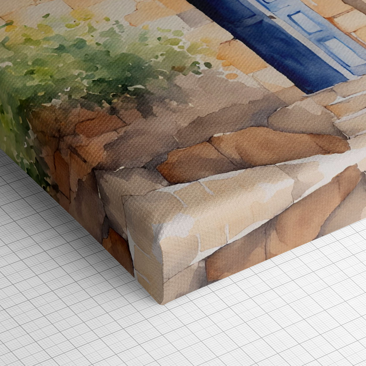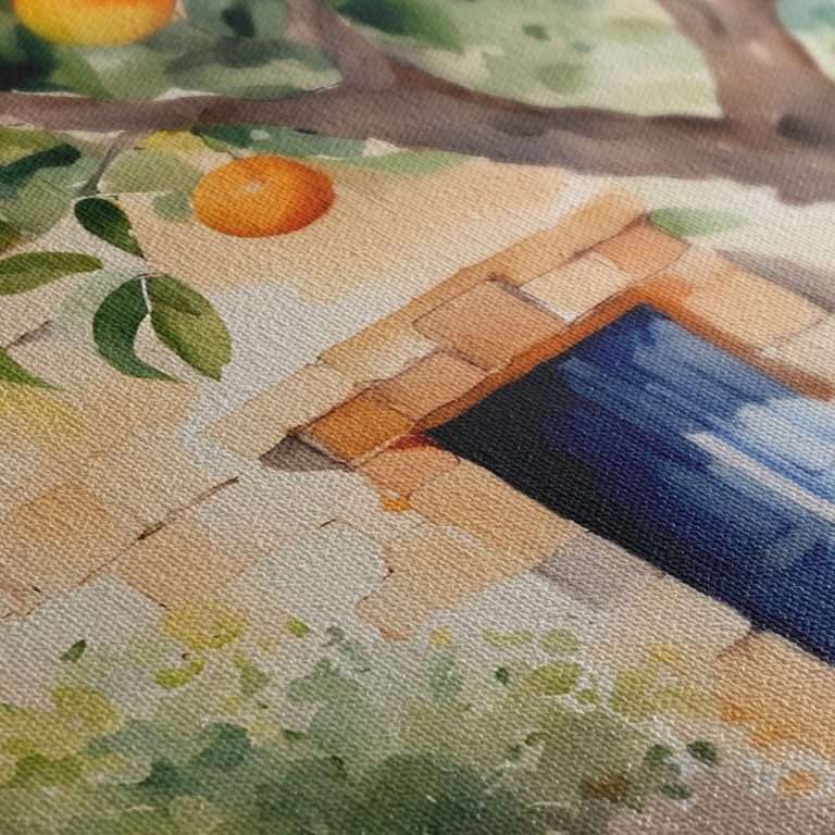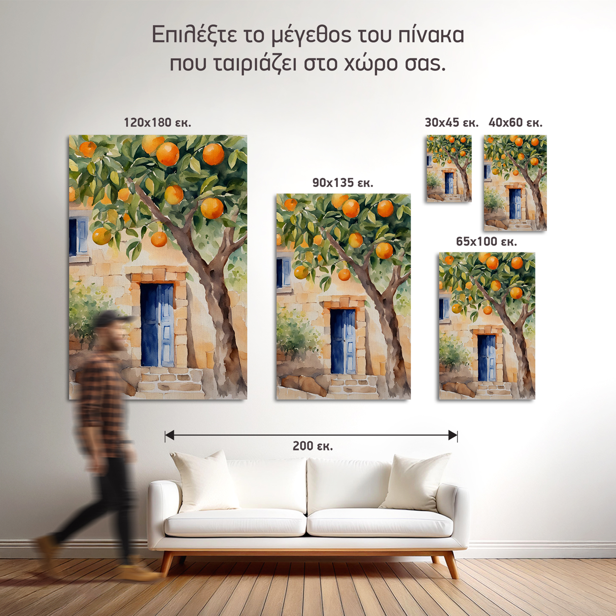 Γραφικός πίνακας που αποτυπώνει την κλασική μεσογειακή ατμόσφαιρα με μια πλούσια πορτοκαλιά γεμάτη ώριμα φρούτα. Η τεχνική της νερομπογιάς προσδίδει απαλότητα και φυσικότητα στην σκηνή. Το παραδοσιακό πέτρινο σπίτι με τη γαλάζια πόρτα και τα ζεστά χρώματα των τοίχων δημιουργεί μια νοσταλγική, ειδυλλιακή εικόνα. Τα πορτοκαλια είναι σε αρμονία με το γαλάζιο της πόρτας και το πράσινο του φυλλώματος. Το έργο εκπέμπει ζεστασιά, γαλήνη και μεσογειακή γοητεία.