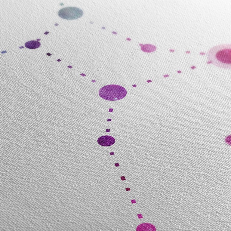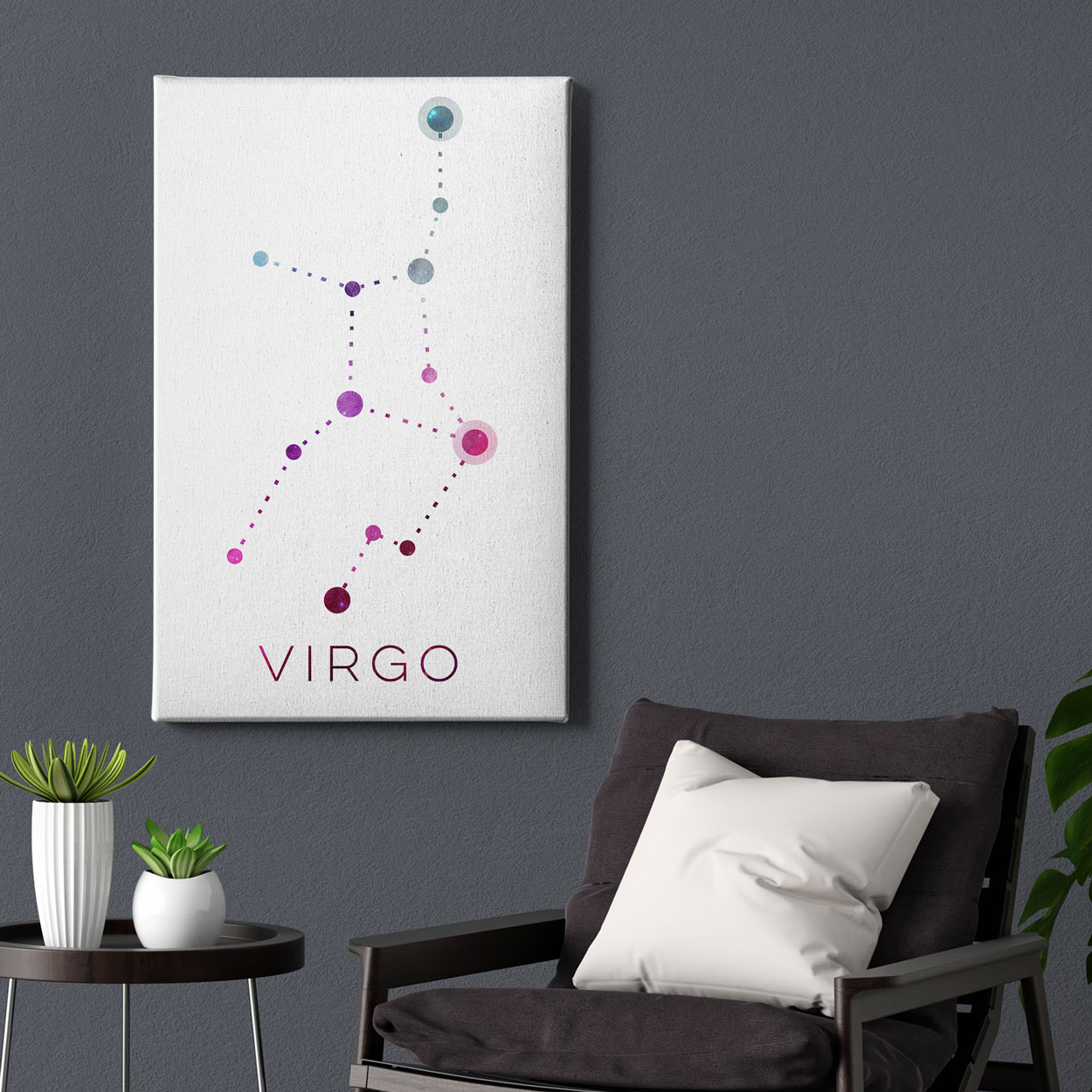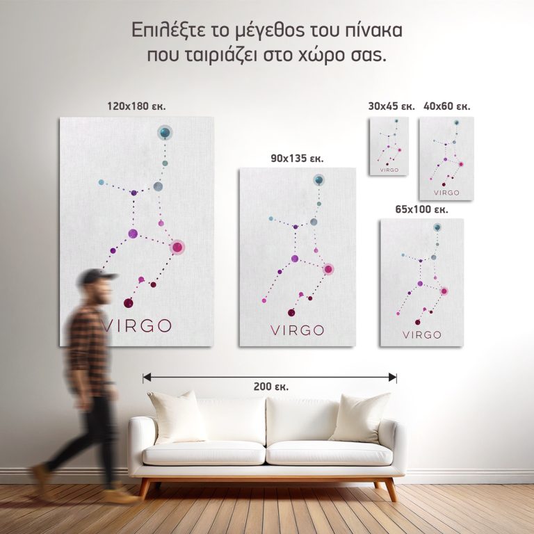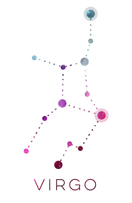 Αυτό το έργο προσεγγίζει το ζώδιο της Παρθένου με ένα παιχνίδι μορφής και ρυθμού. Οι συνδέσεις ανάμεσα στα αστέρια σχηματίζονται από σειρά μικρών κουκκίδων που δίνουν την αίσθηση μεθοδικότητας και ρυθμικής πορείας. Η γραμμική κίνηση της σύνθεσης υποδηλώνει την οργανωτική διάθεση και την πρακτική σοφία της Παρθένου, ενώ οι ροζ-μώβ τόνοι προσθέτουν μια διακριτική τρυφερότητα, την ανθρώπινη πλευρά της τελειομανίας. Έργο που λειτουργεί σε ήσυχους, επαγγελματικούς ή στοχαστικούς χώρους.