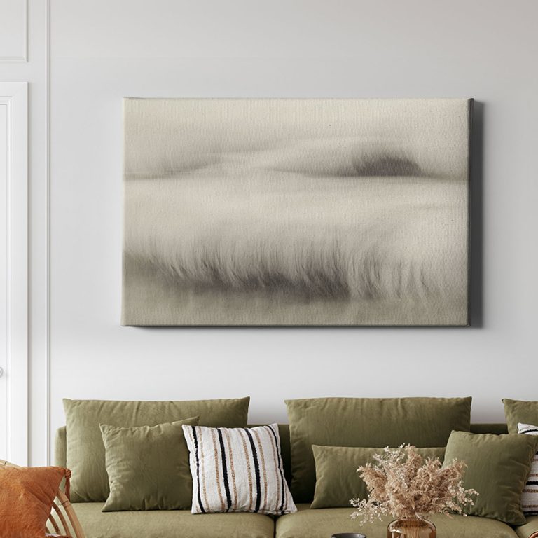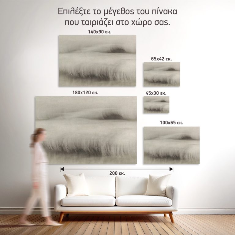 Ένας αφαιρετικός πίνακας σε ήπιους, σχεδόν μονοχρωματικούς τόνους, που αποτυπώνει την αιθέρια κίνηση ενός λιβαδιού καθώς λυγίζει απαλά στον άνεμο. Η θολότητα και οι απαλές γραμμές δημιουργούν την αίσθηση ενός ονειρικού τοπίου, μιας στιγμής που δεν είναι απόλυτα πραγματική αλλά ζωντανή στη μνήμη και το συναίσθημα. Ένα έργο που προκαλεί τον θεατή να στοχαστεί και να χαθεί στη ροή, ιδανικό για χώρους όπου η ηρεμία και η μινιμαλιστική αισθητική κυριαρχούν.