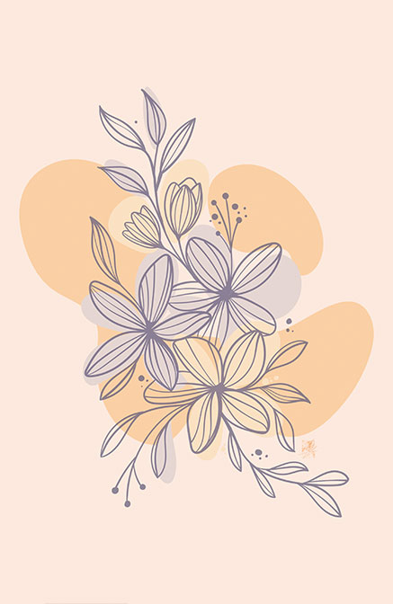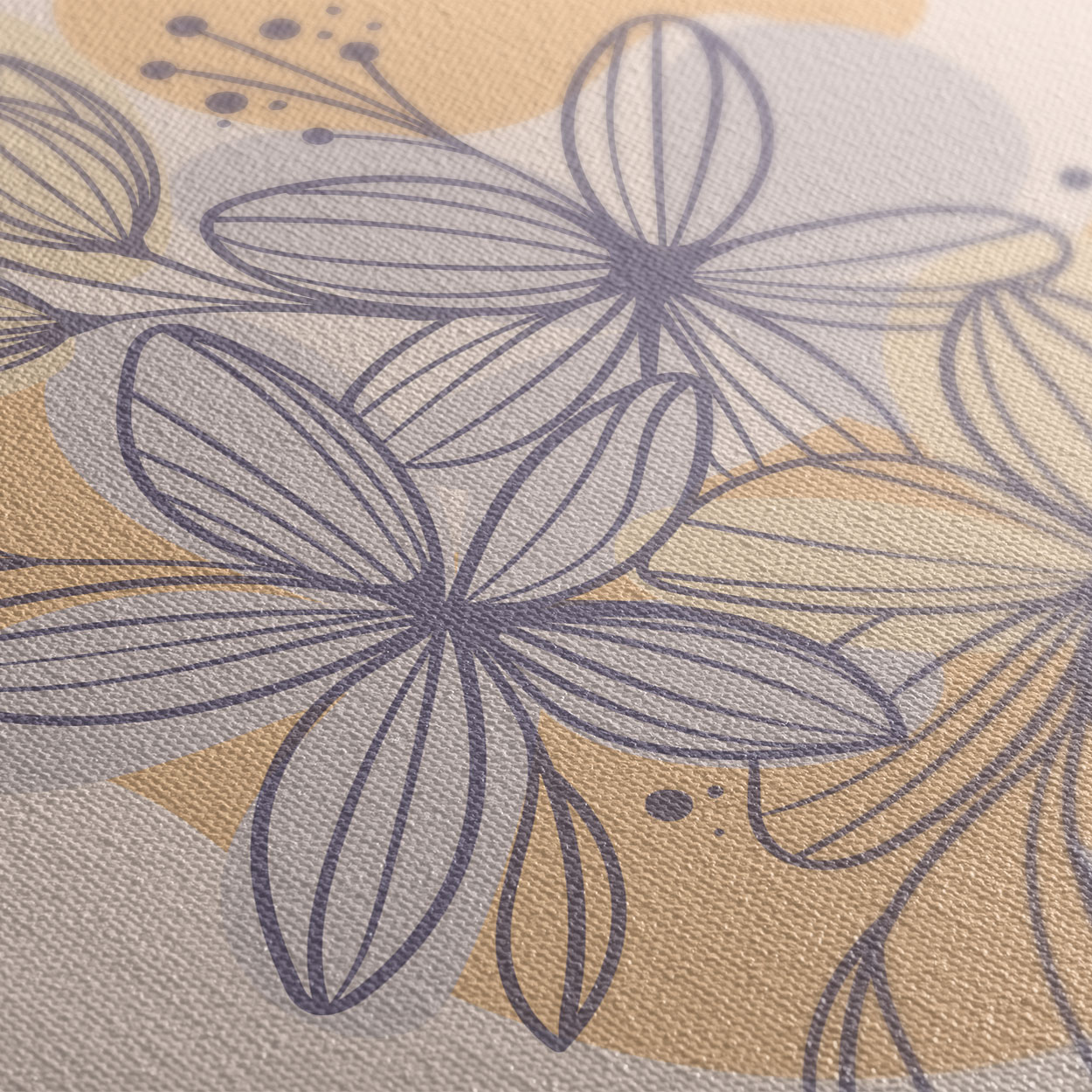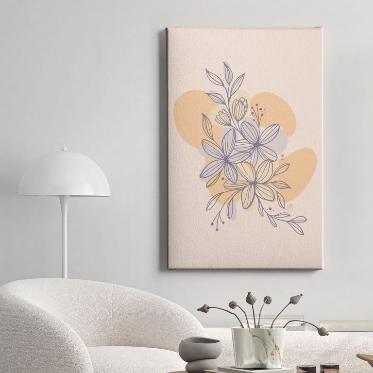 Απαλή, μοντέρνα σύνθεση με ανθοδέσμη σε γραμμικό σχέδιο λιλά/γκρι και γεμίσματα σε ζεστές παστέλ αποχρώσεις ροδακινί. Καθαρό, κομψό ύφος που φέρνει φρεσκάδα και ηρεμία. Ταιριάζει σε υπνοδωμάτιο, σαλόνι ή παιδικό δωμάτιο και δένει όμορφα με ξύλο, λινά υφάσματα και ουδέτερους τόνους.