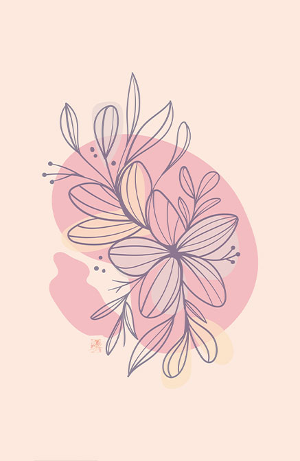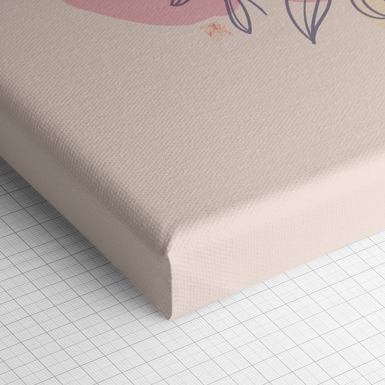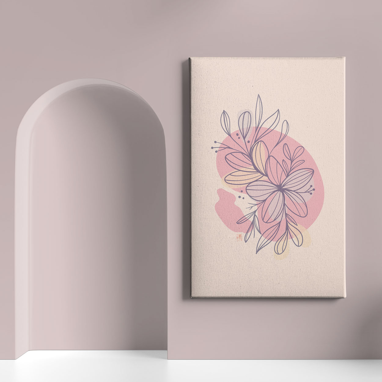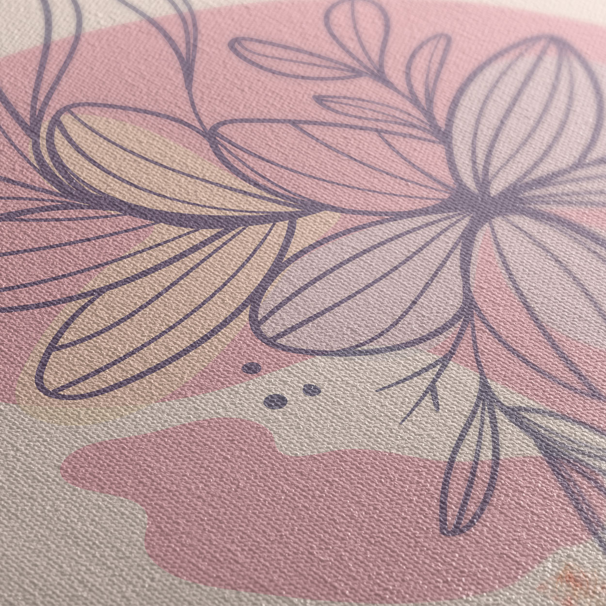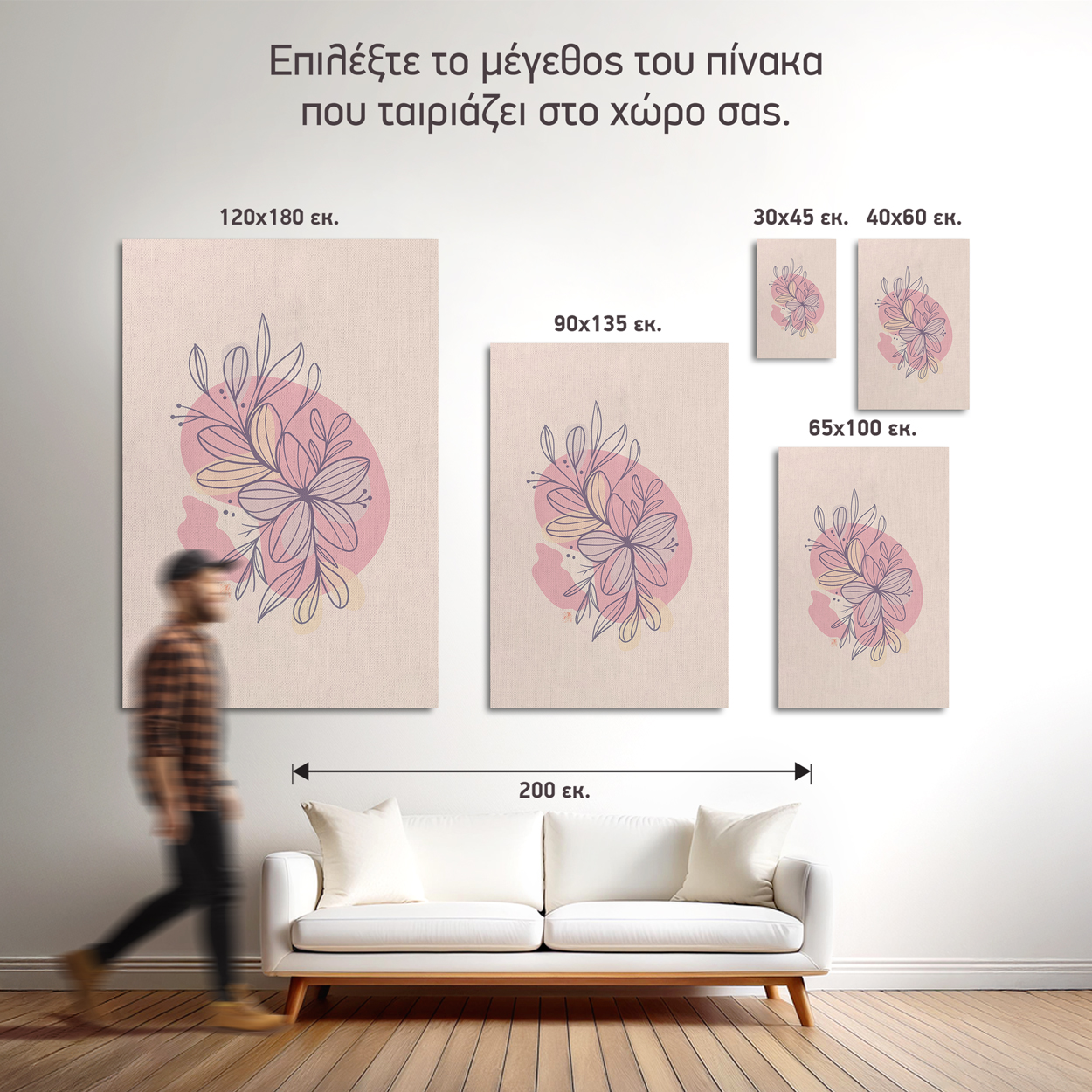 Κομψή ανθοδέσμη σε λιλά/γκρι γραμμικό σχέδιο με απαλές παστέλ γεμίσματα σε ροζ και ροδακινί, πάνω σε ζεστό ροζ φόντο. Απαλή, ρομαντική αισθητική που φωτίζει τον χώρο χωρίς να τον βαραίνει. Ταιριάζει σε υπνοδωμάτιο, σαλόνι ή παιδικό δωμάτιο και δένει όμορφα με φυσικό ξύλο και ουδέτερα υφάσματα.