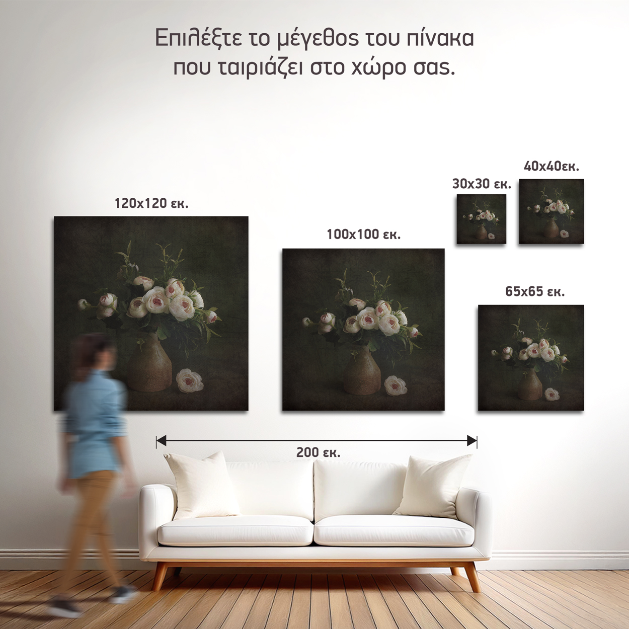 Ένας πίνακας που αποπνέει ρομαντισμό, τρυφερότητα και διαχρονική κομψότητα. Ένα βάζο γεμάτο ροζ άνθη, φιλοτεχνημένα με λεπτομέρεια και απαλές πινελιές, φέρνει την ειρήνη της φύσης και τη ζεστασιά της άνοιξης στο εσωτερικό κάθε χώρου. Το έργο αγκαλιάζει τη γυναικεία ευαισθησία, τη γλυκύτητα των απλών στιγμών και την εκφραστικότητα της σιωπηλής ομορφιάς. Μια επιλογή που συμπληρώνει ιδανικά κάθε ρομαντική ή vintage διακόσμηση.