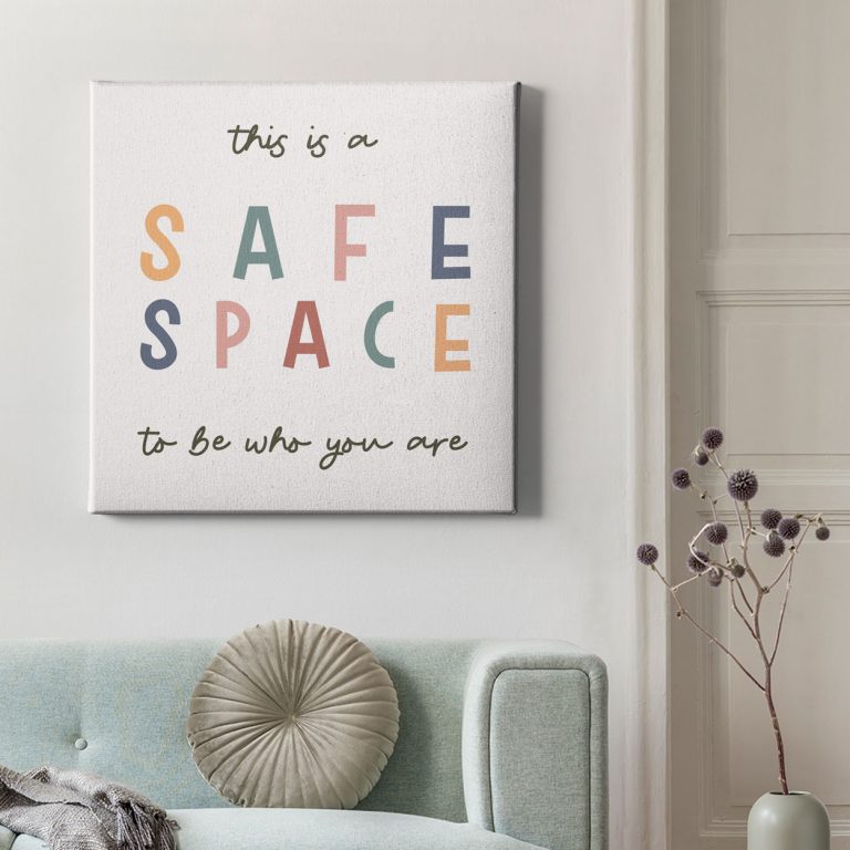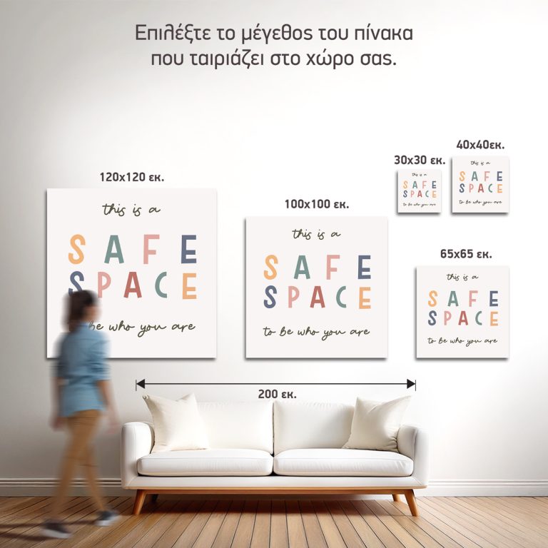Οι πίνακες ζωγραφικής με φράσεις όπως ''Safe Space'' μπορoύν να εκφράσουν μια μεγάλη ποικιλία συναισθημάτων, ανάλογα με τα χρώματα και την γραμματοσειρά που χρησιμοποιούν. Θα ανανεώσουν το χώρο σας με τα θερμά χρώματα και θα σας κάνουν να νιώσετε ασφάλεια, αγάπη και ήρεμία.