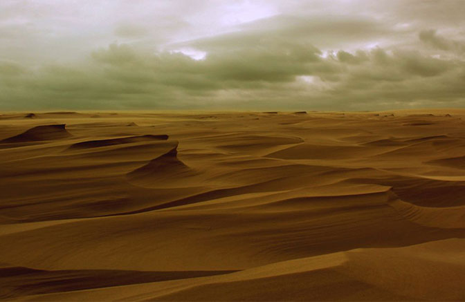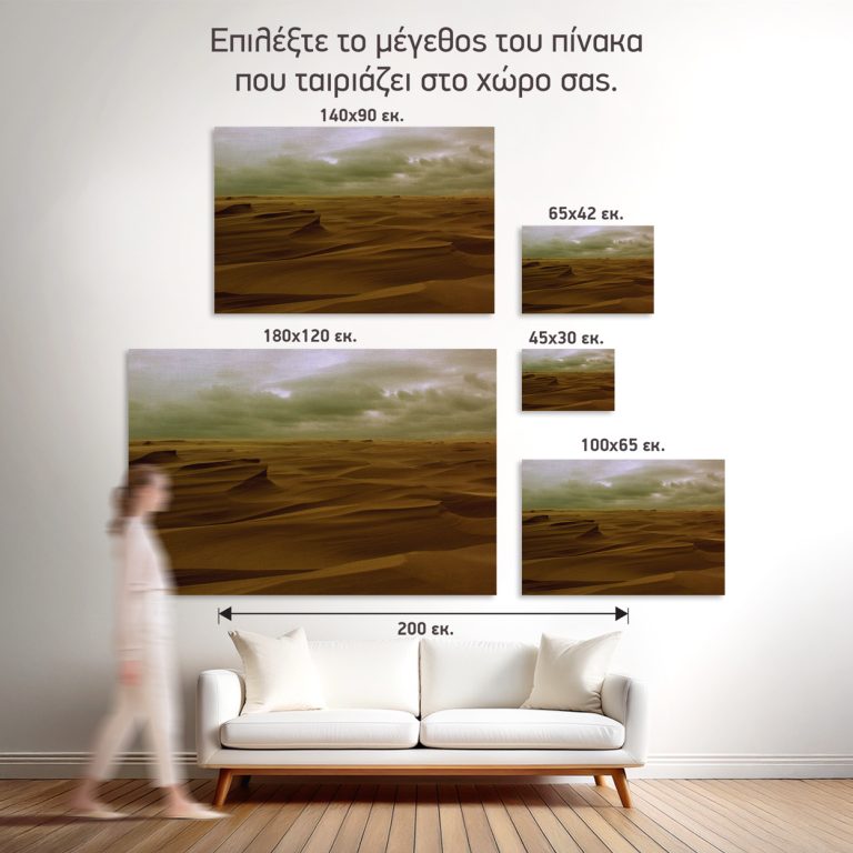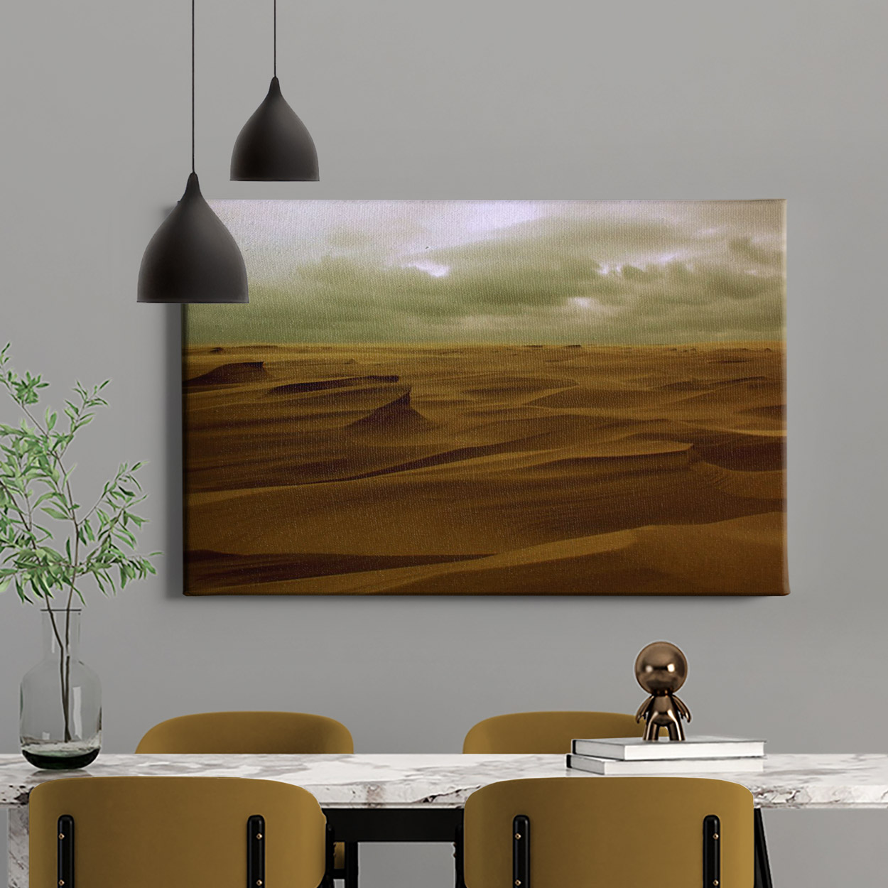 Ένας εντυπωσιακός πίνακας που αποτυπώνει την άγρια ομορφιά της ερήμου κάτω από έναν βαρύ, συννεφιασμένο ουρανό. Οι κυματιστές αμμοθίνες σχηματίζουν φυσικά μοτίβα, δημιουργώντας ένα τοπίο γεμάτο μυστήριο και δύναμη. Η αντίθεση μεταξύ της θερμής άμμου και των ψυχρών ουρανών προσδίδει δραματικότητα και βάθος. Μια εξαιρετική επιλογή για χώρους με βιομηχανικό ή μποέμ στυλ, που αναζητούν την απόλυτη αίσθηση απομόνωσης και εσωτερικότητας.