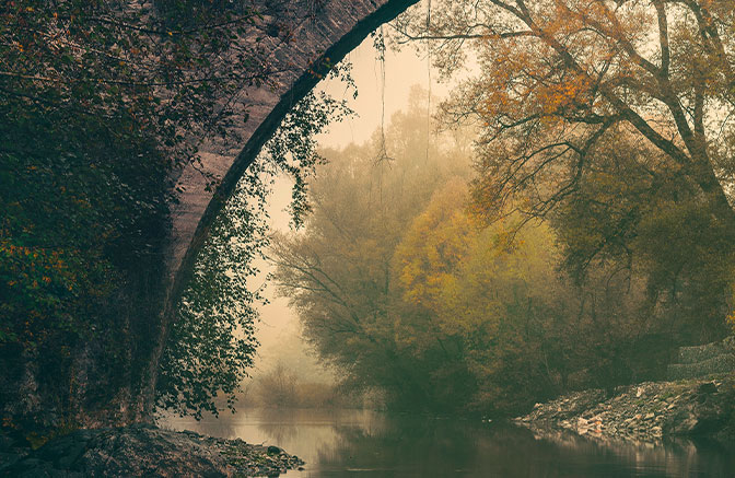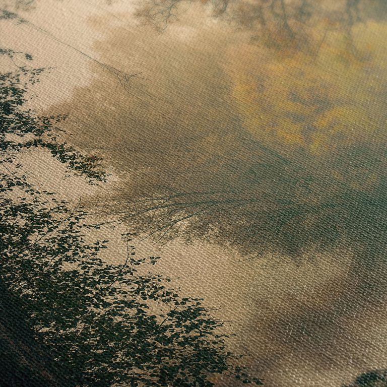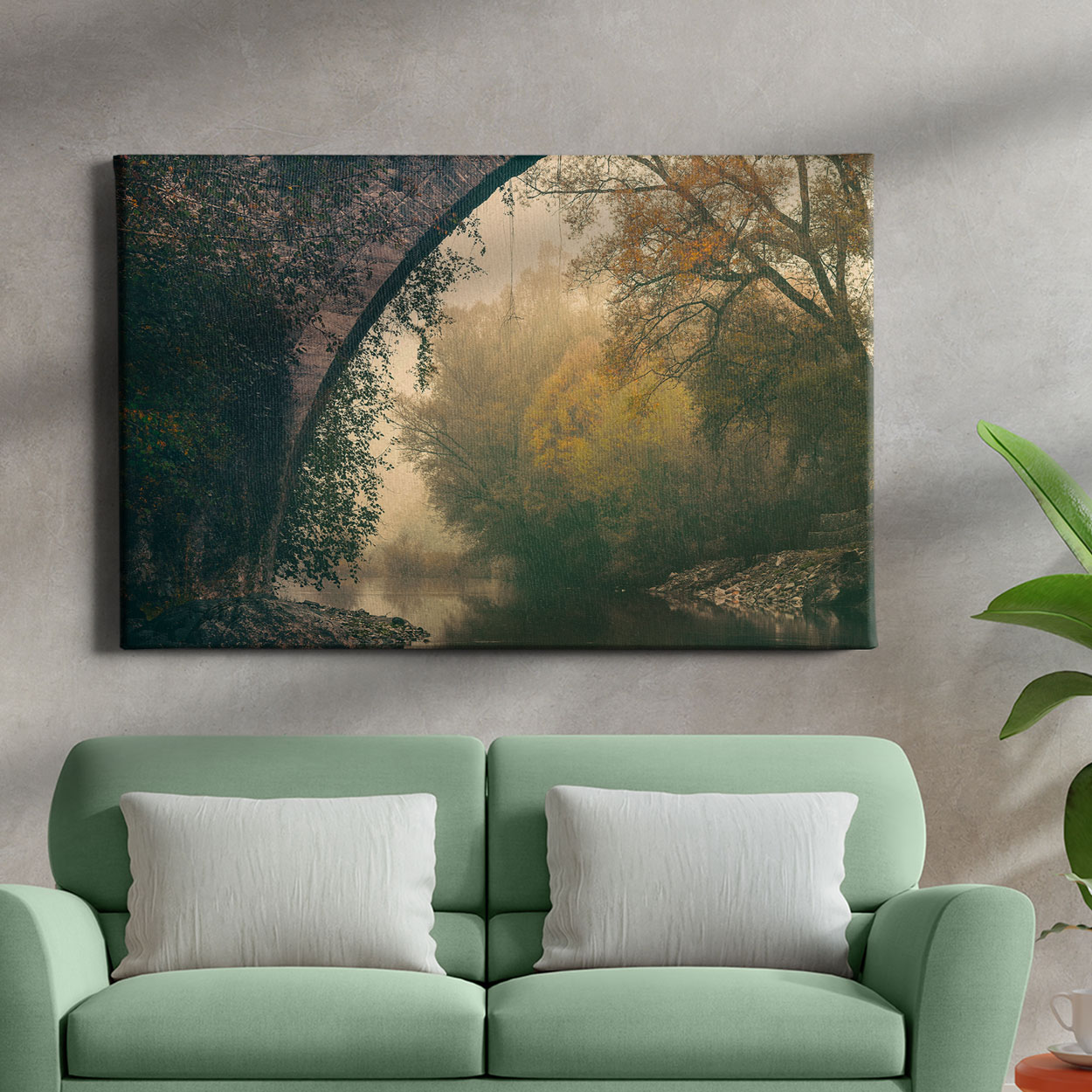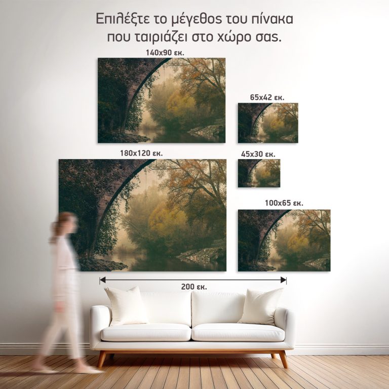 Ένας πίνακας με τοπίο βγαλμένο από μύθο, με την πέτρα, το νερό και το πράσινο να συνυπάρχουν αρμονικά, προσφέροντας μια εικόνα απόλυτης ηρεμίας και φυσικής γαλήνης. Η ομίχλη τυλίγει το τοπίο σαν ένα πέπλο μυστηρίου και σιωπής. Μεταφέρει τον θεατή στην άγρια και αυθεντική ομορφιά της ελληνικής φύσης, ιδανικός για χώρους που αναζητούν ηρεμία, ρίζες και σύνδεση με το φυσικό τοπίο.