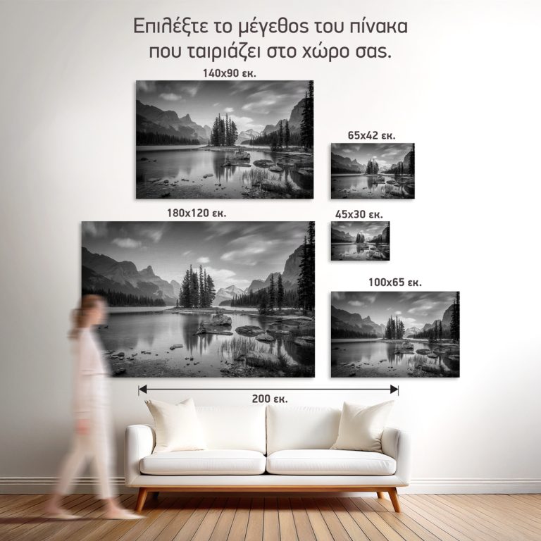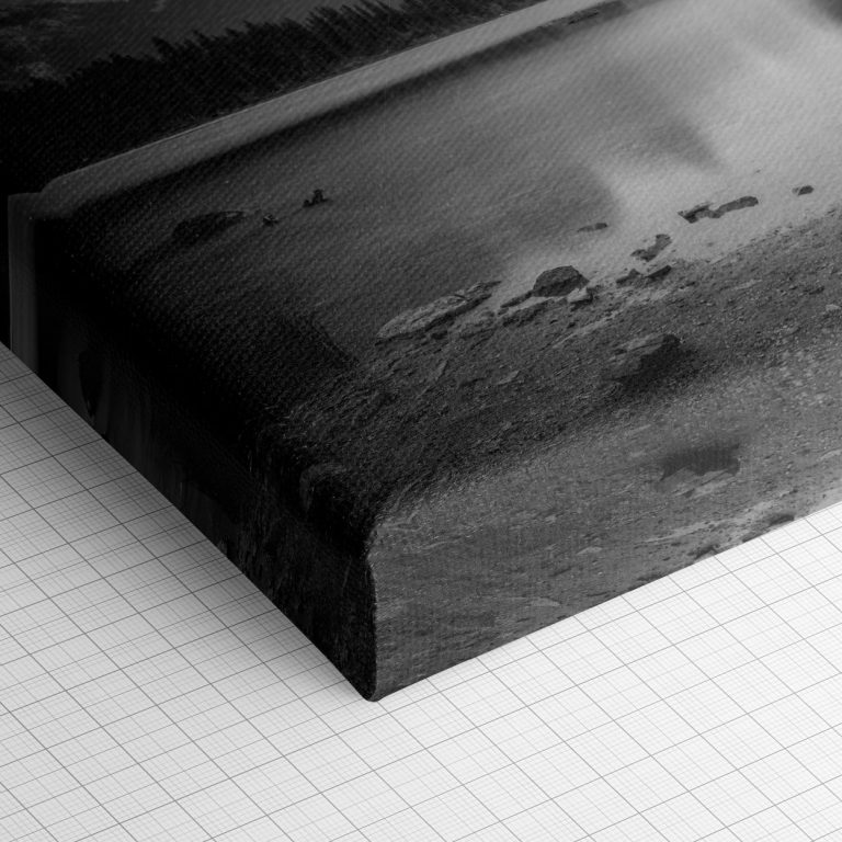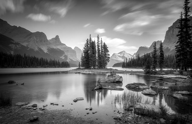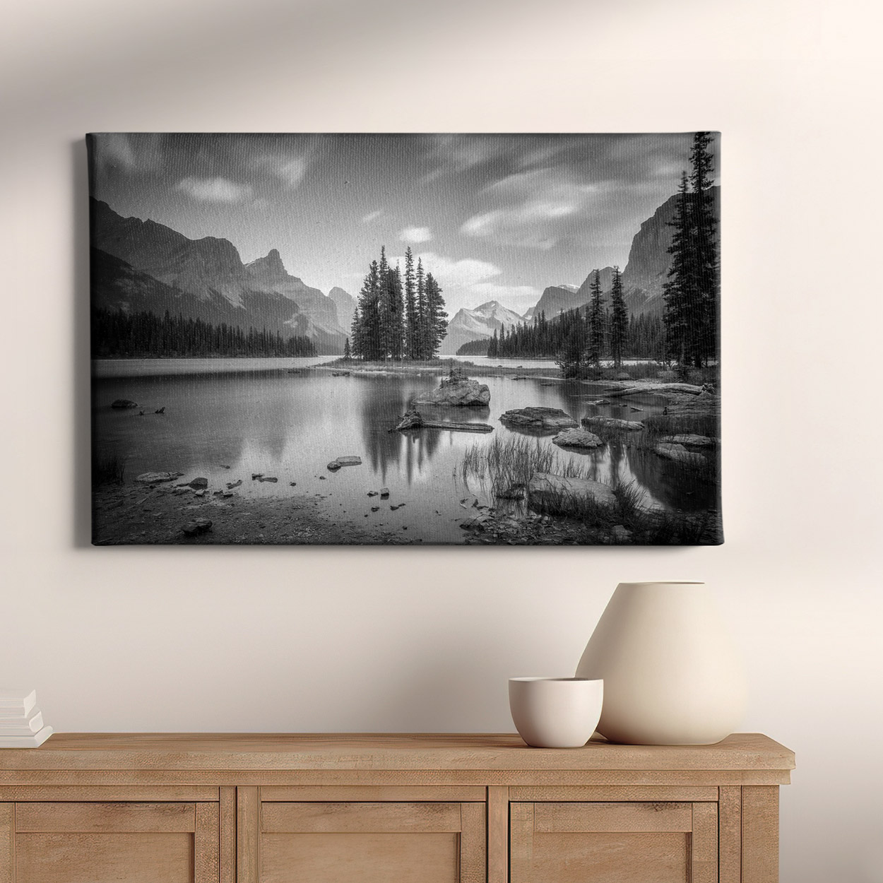 Ένα καθηλωτικό ασπρόμαυρο τοπίο που αποτυπώνει την απόκοσμη γαλήνη του Spirit Island στον Καναδά. Η μικρή νησίδα περιτριγυρισμένη από ήρεμα νερά και πυκνά δέντρα, δεσπόζει στο κέντρο της λίμνης με φόντο τα επιβλητικά βουνά των Rockies. Η έλλειψη χρώματος ενισχύει τη διαχρονικότητα της σκηνής, προσδίδοντας βάθος, σιωπή και δύναμη. Ένας πίνακας που φέρνει στο χώρο σας την ομορφιά της άγριας φύσης μέσα από έναν καλλιτεχνικό φακό ηρεμίας και ισορροπίας.