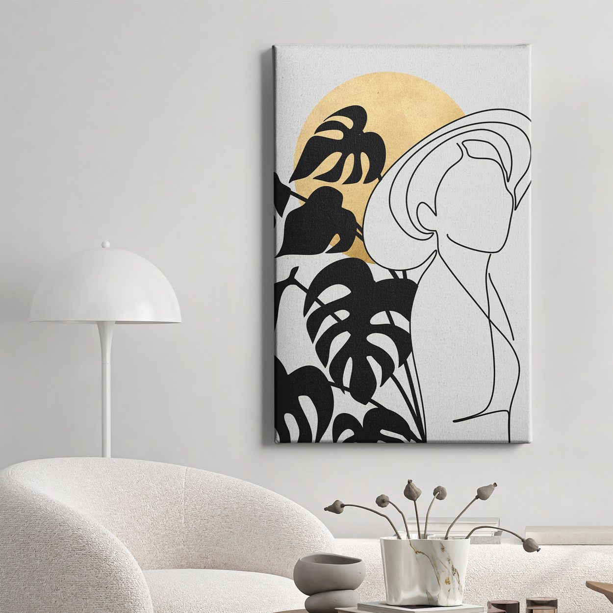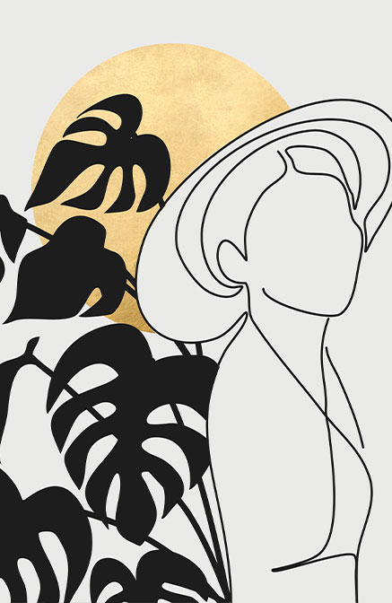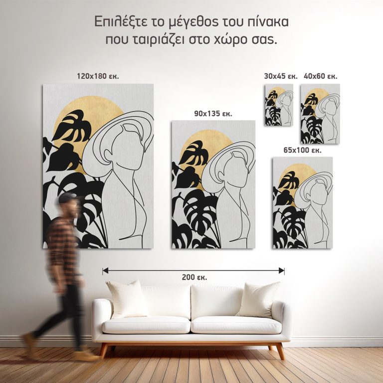 Μινιμαλιστική boho σύνθεση με λεπτές γραμμές που σχηματίζουν γυναικεία φιγούρα με καπέλο, μοτίβο με μεγάλα φύλλα και χρυσό ηλιοβασίλεμα στο φόντο. Καθαρή αισθητική που συνδυάζει μοντέρνο σχεδιασμό και ζεστή, κομψή διάθεση, ιδανικό για σαλόνι, είσοδο ή υπνοδωμάτιο