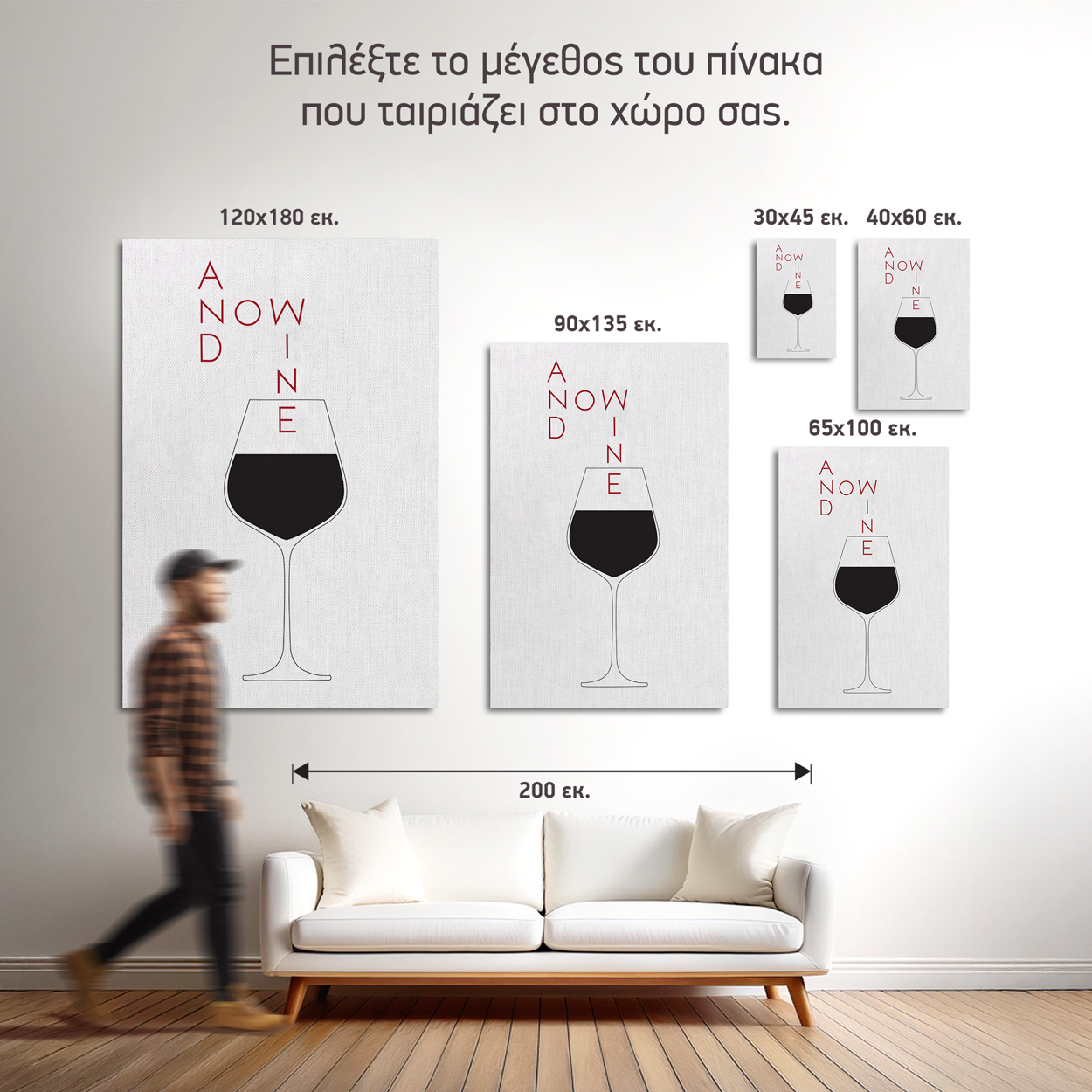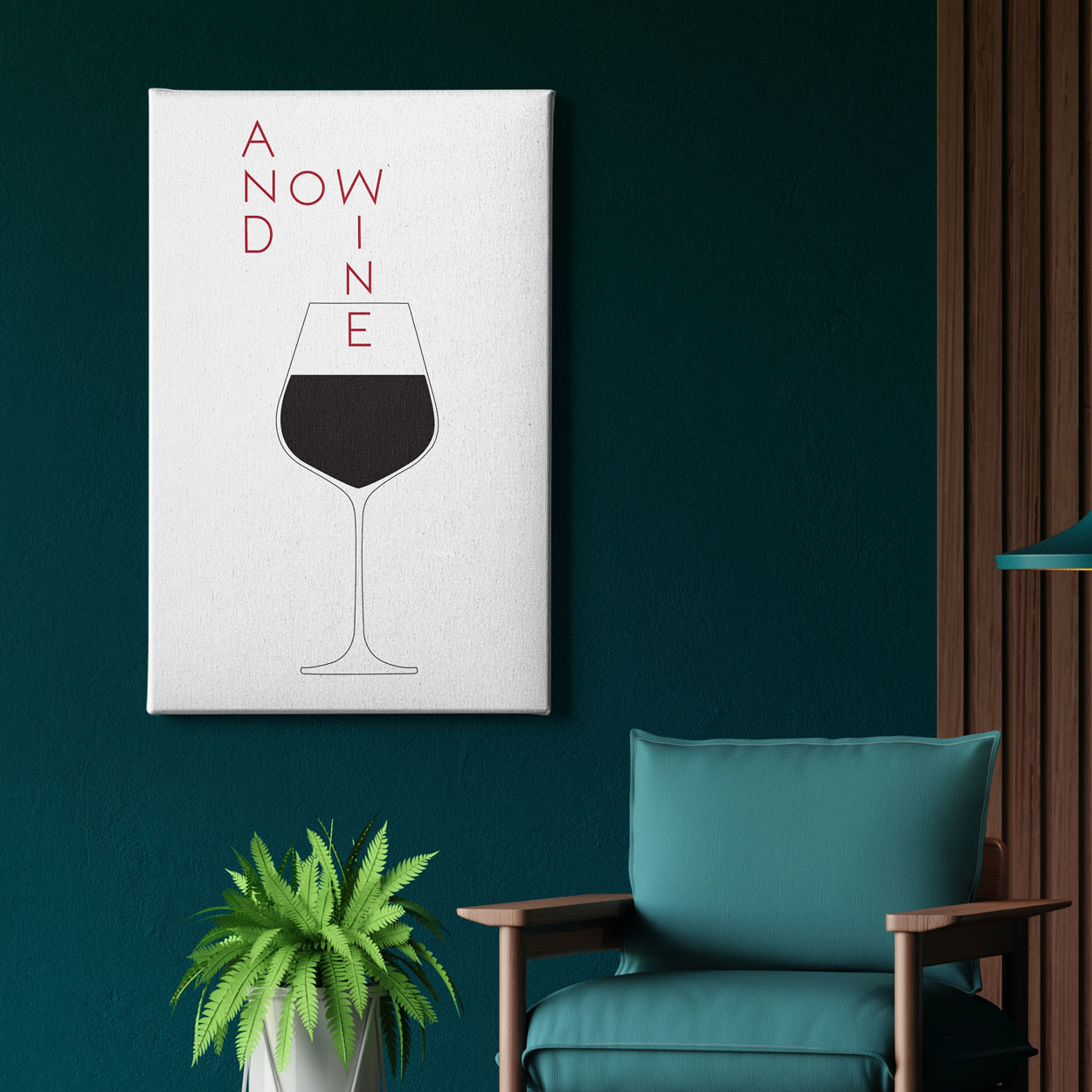 Μινιμαλιστικός πίνακας που συνδυάζει τυπογραφία με την κλασική εικόνα του κρασιού. Η έξυπνη σύνθεση των γραμμάτων "AND NOW WINE" δημιουργεί μια playful και sophisticated διάταξη. Το κομψό σχήμα του ποτηριού με το σκούρο κρασί αντιπαραβάλλεται με το καθαρό, λευκό φόντο, δημιουργώντας μια αντίθεση. Ιδανικός για χώρους που χρειάζονται wine-themed διακόσμηση με σύγχρονο, minimalist twist.