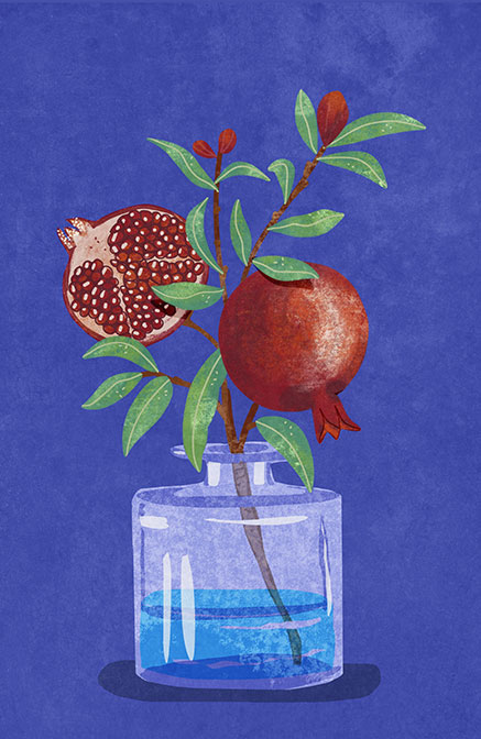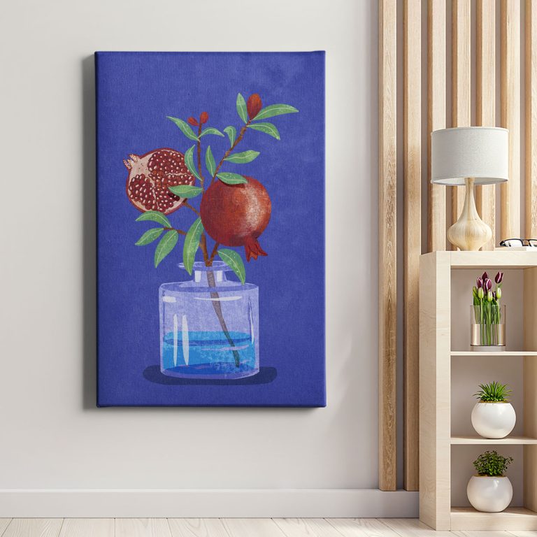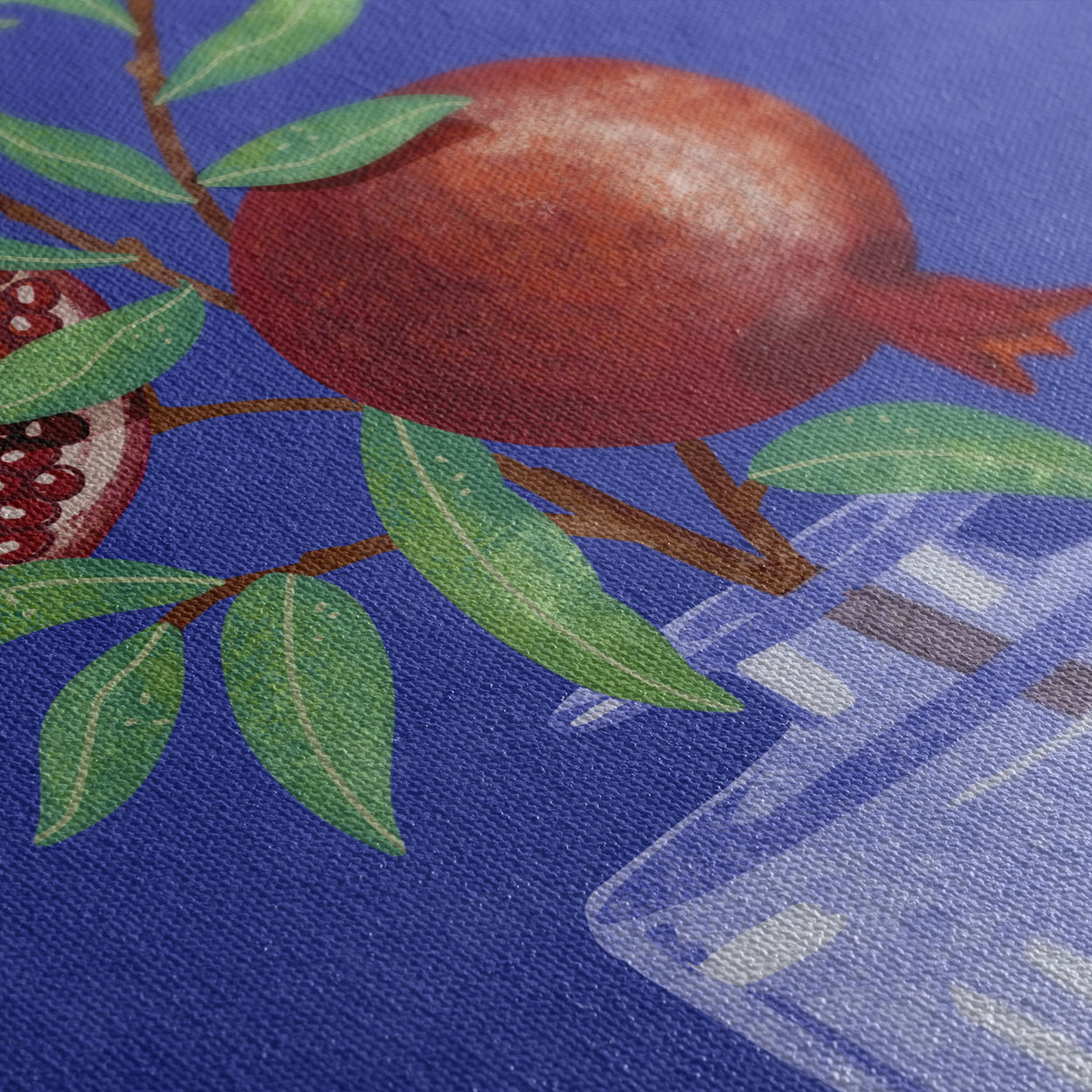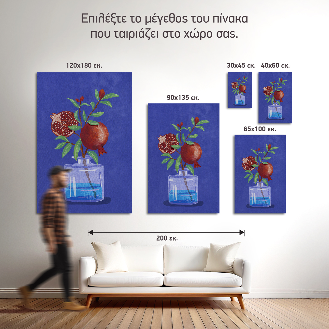 Μοντέρνος πίνακας που παρουσιάζει ένα κλαδί ροδιού σε γυάλινο βάζο με νερό. Το έντονο μπλε φόντο αντιτίθεται εντυπωσιακά με τα κόκκινα ρόδια και τα πράσινα φύλλα. Το ένα ρόδι φαίνεται ανοιχτό, αποκαλύπτοντας τους κόκκινους σπόρους του, ενώ το άλλο παραμένει ακέραιο. Το έργο συνδυάζει τη φυσική ομορφιά με μοντέρνα εικονογραφική τεχνική. Τα χρώματα είναι ζωντανά και αντιθετικά, δημιουργώντας μια δυναμική σύνθεση. Ιδανικός για σύγχρονους χώρους που χρειάζονται φρέσκια, έντονη διακόσμηση με μεσογειακή νότα.