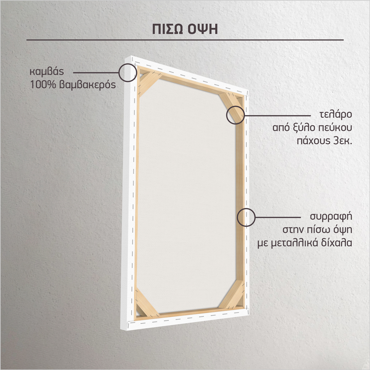 Πίνακας Ζωγραφικής εκτυπωμένος σε 100% βαμβακερό καμβά υψηλής ποιότητας. Επιλέξτε προαιρετικά ο πίνακάς σας να έχει ξύλινη κορνίζα με διαθέσιμα τα χρώματα φυσικό ξύλο, μαύρο και λευκό. Το πάχος του ξύλου της κορνίζας είναι 1 cm x 4 cm.