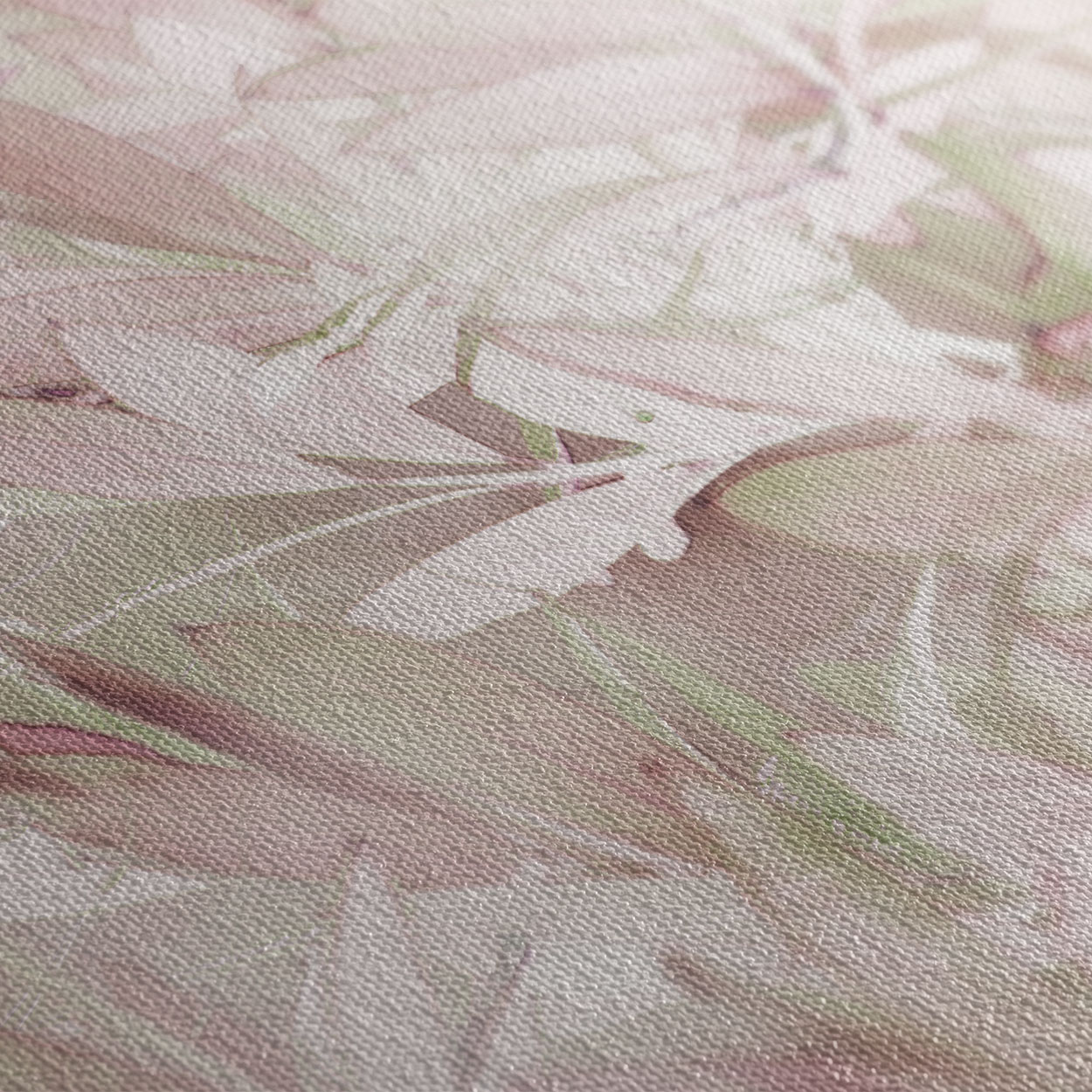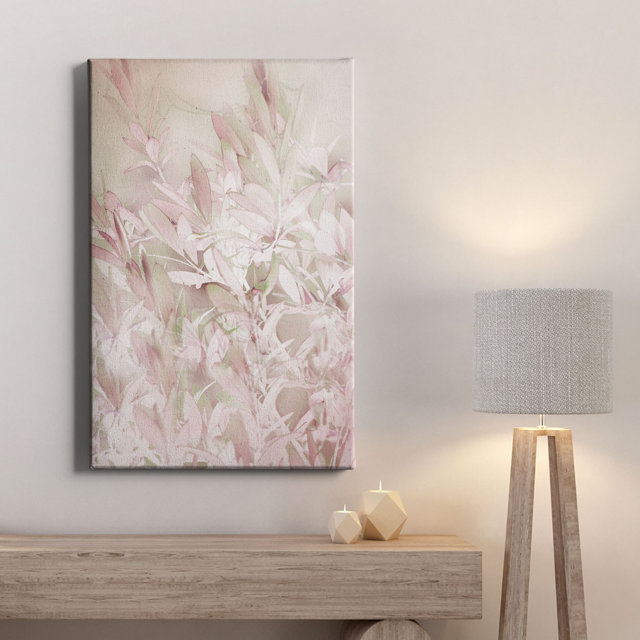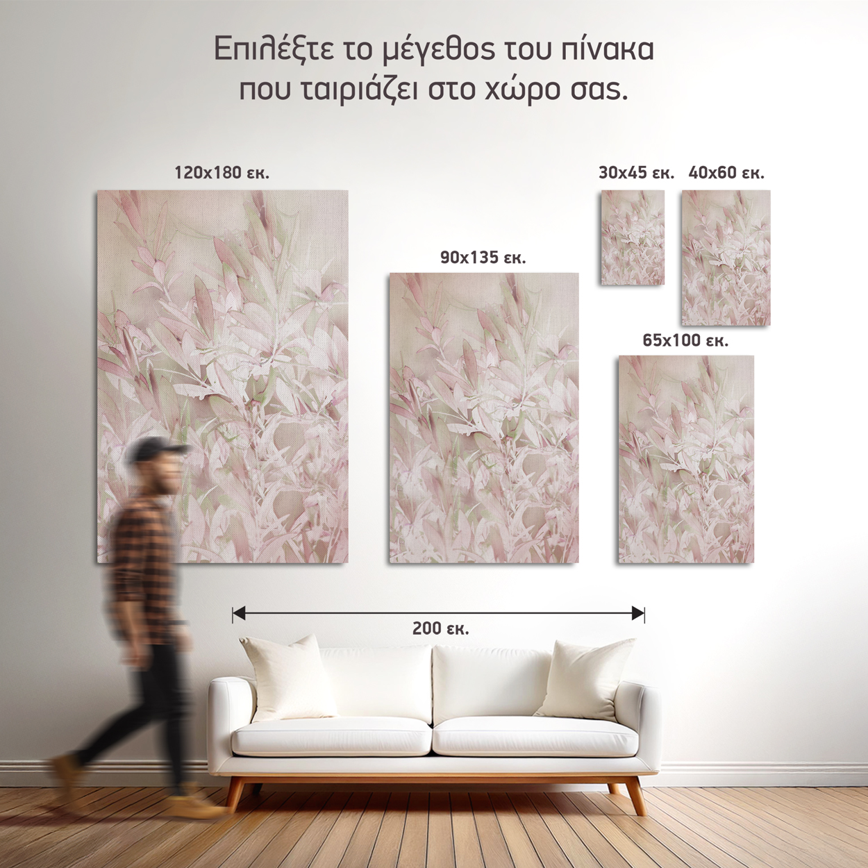 Ονειρικός πίνακας ζωγραφικής με μοτίβα σε εξαιρετικά απαλούς τόνους. Τα στυλιζαρισμένα φύλλα και η βλάστηση παρουσιάζονται με watercolor αισθητική σε ροζ, λευκούς και πρασινωπούς τόνους, δημιουργώντας μια ethereal ατμόσφαιρα. Η τεχνική θυμίζει vintage botanical illustrations με σύγχρονη romantic προσέγγιση, ιδανική για χώρους που χρειάζονται απαλότητα και feminine στοιχεία.