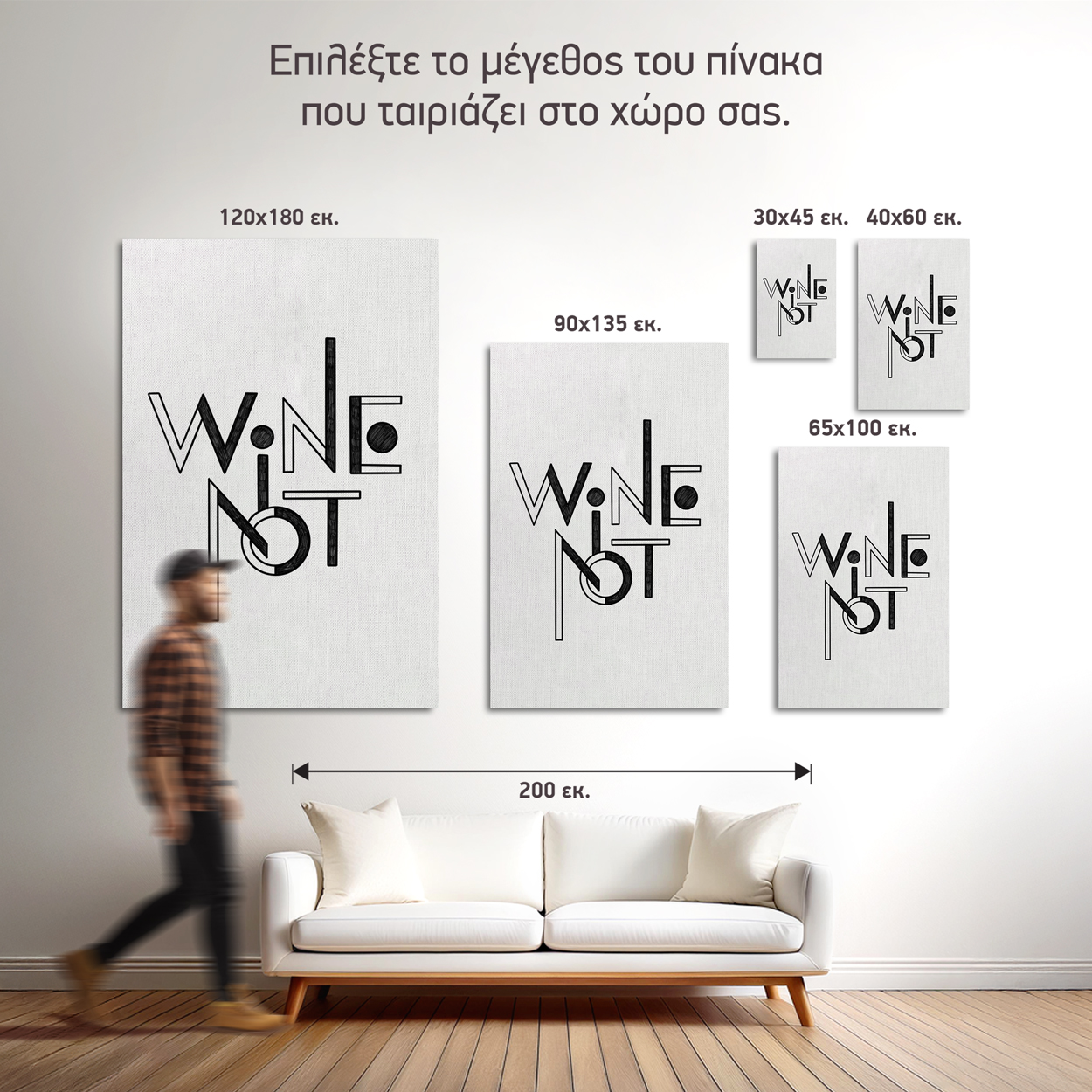 Ένας κομψός και χιουμοριστικός λεκτικός πίνακας ζωγραφικής που συνδυάζει τη φράση "Wine Not" με μοντέρνα τυπογραφία. Η τέλεια πρόταση για λάτρεις του κρασιού που απολαμβάνουν τη ζωή με στυλ και χιούμορ. Αυτός ο πίνακας δεν είναι απλώς διακοσμητικός, είναι μια δήλωση διάθεσης! Προσθέτει χαλαρότητα, κομψότητα και μια νότα "γευστικής" προσωπικότητας σε κάθε χώρο.