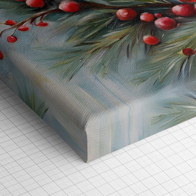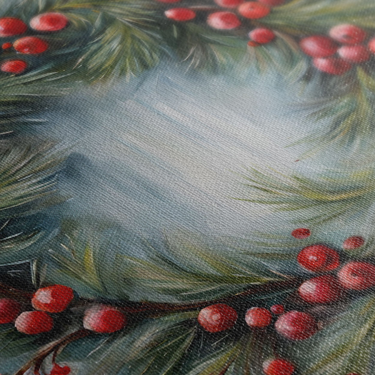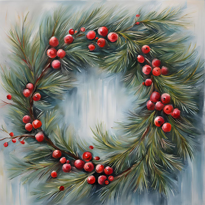 Ρεαλιστική απεικόνιση στεφανιού από πευκοβελόνες και κόκκινους καρπούς. Η απαλή, δροσερή παλέτα και η πλούσια υφή δημιουργούν κομψή, εορταστική ατμόσφαιρα. Ιδανικό για ρεσεψιόν, καταστήματα και γραφεία, καθώς και για το σπίτι, σαλόνι ή είσοδο, για διακριτική, εορταστική διακόσμηση.