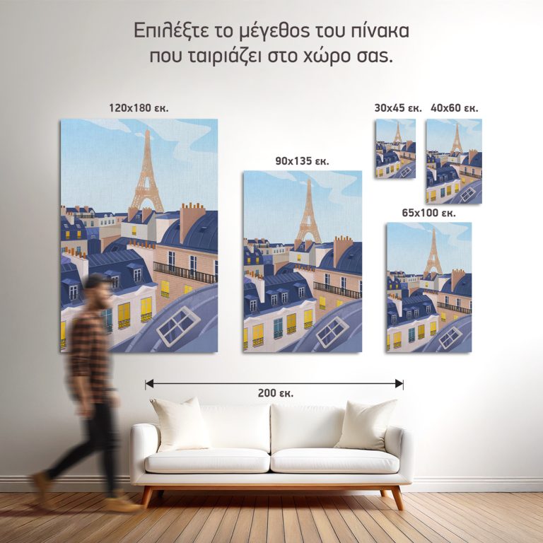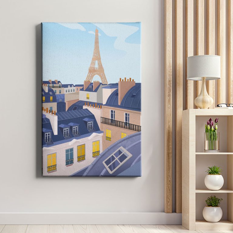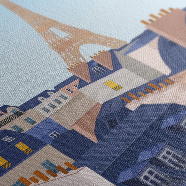 Μια ζωγραφιά γεμάτη ζωντανά χρώματα και παλμό, που αποτυπώνει την ομορφιά της παριζιάνικης αρχιτεκτονικής με φόντο τον εμβληματικό Πύργο του Άιφελ. Τα παραδοσιακά κτίρια με τα μπαλκόνια, τις καμινάδες και τις κεραμιδένιες στέγες γεμίζουν τον καμβά με χαρακτήρα και γοητεία, ενώ ο πύργος στέκει πίσω τους επιβλητικός, σαν διαχρονικό σύμβολο της πόλης του φωτός. Ιδανικός για καθιστικά, υπνοδωμάτια, επαγγελματικούς χώρους, καφέ ή boutique με ευρωπαϊκή ή ταξιδιωτική αισθητική.