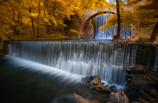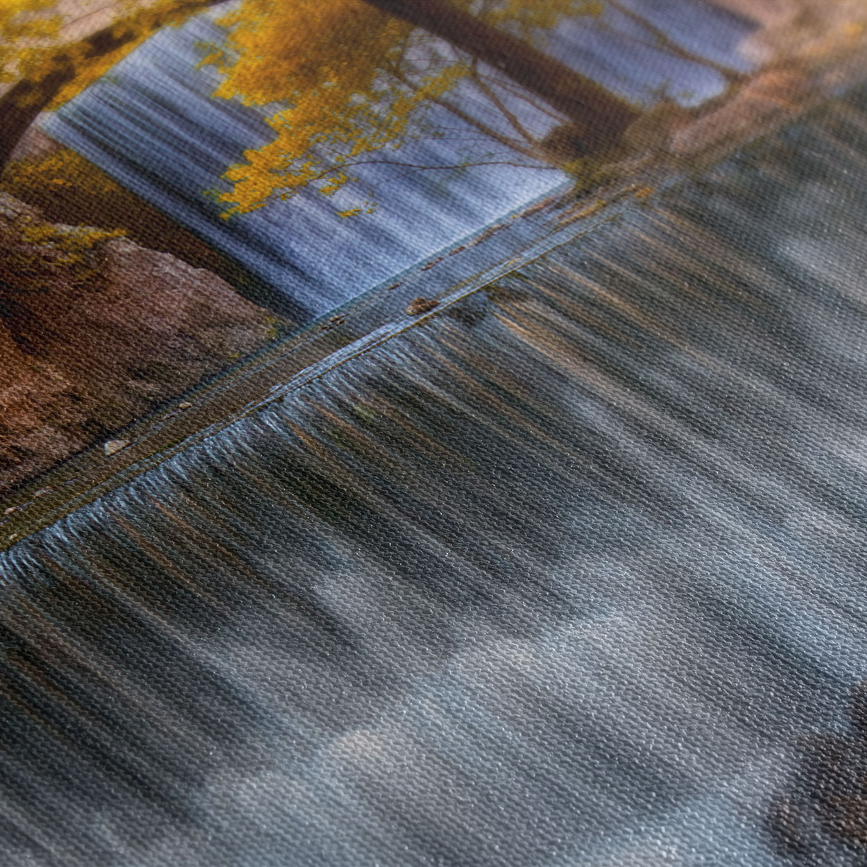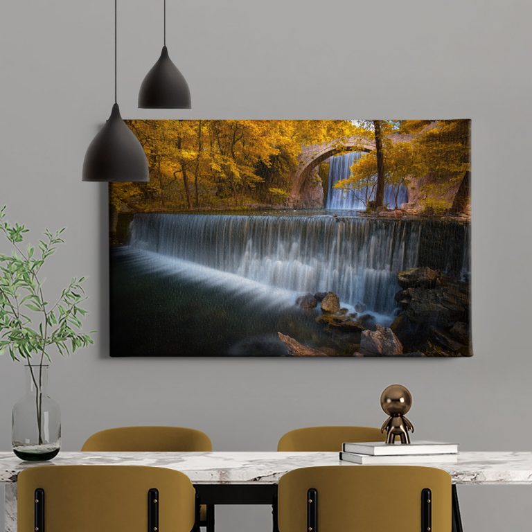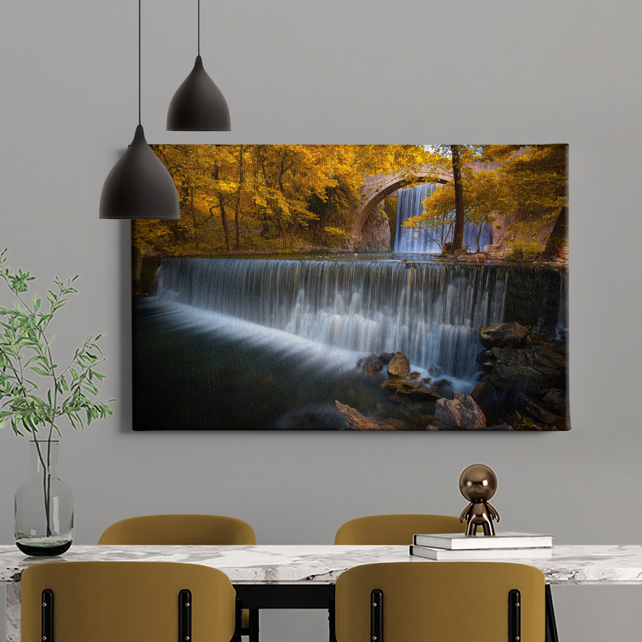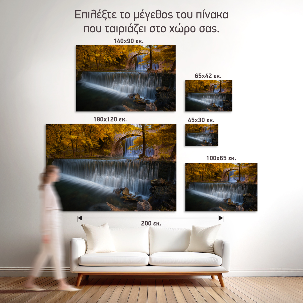 Ένα εντυπωσιακό φθινοπωρινό τοπίο που αποτυπώνει την άγρια ομορφιά και την ηρεμία της ελληνικής φύσης. Στο επίκεντρο, το ιστορικό πέτρινο γεφύρι της Παλαιοκαρυάς στέκεται περήφανο ανάμεσα στα πορτοκαλί φύλλα των δέντρων, ενώ οι καταρράκτες κυλούν αρμονικά κάτω απ' αυτό, προσθέτοντας ζωντάνια και κίνηση στη σκηνή. Ο πίνακας αποπνέει γαλήνη, νοσταλγία και σεβασμό στην παράδοση, με μια παλέτα θερμών χρωμάτων που μεταφέρει τον θεατή σε ένα ήρεμο φθινοπωρινό απόγευμα στην ελληνική ύπαιθρο. Ιδανικός για εξοχικά, σαλόνια, παραδοσιακούς χώρους φιλοξενίας, ή για όσους θέλουν ένα «παράθυρο» στην αυθεντική φύση της Ελλάδας.