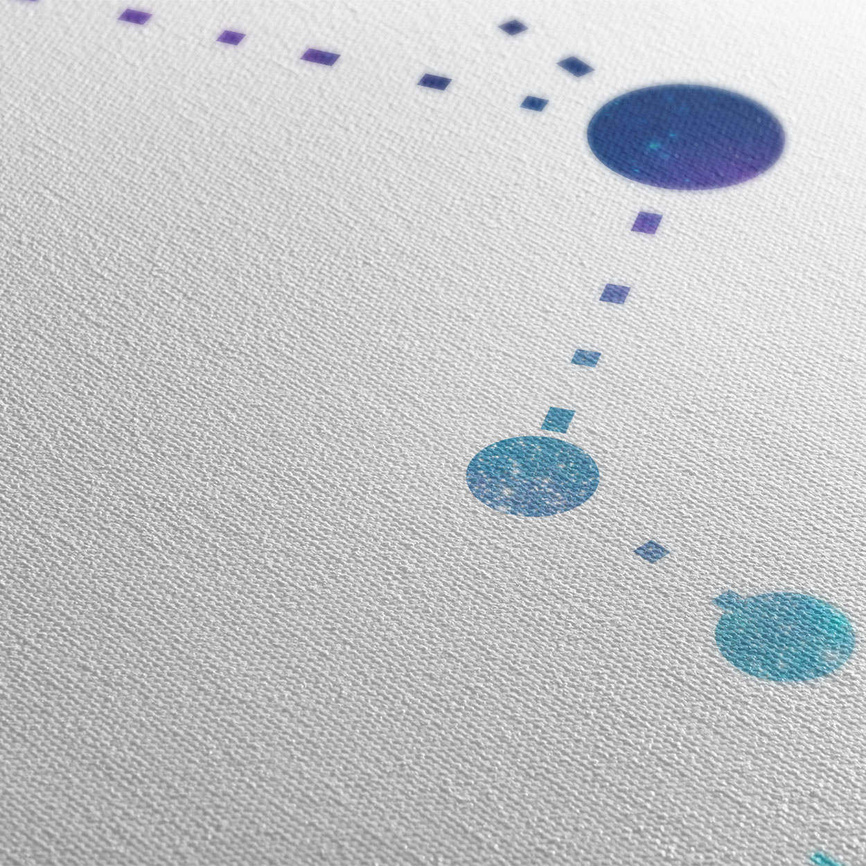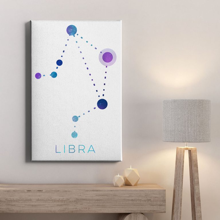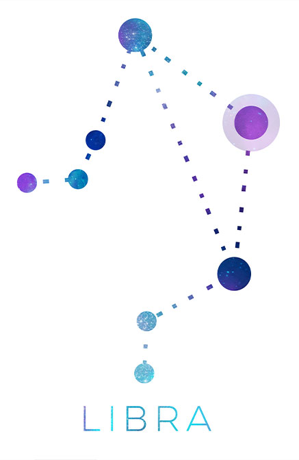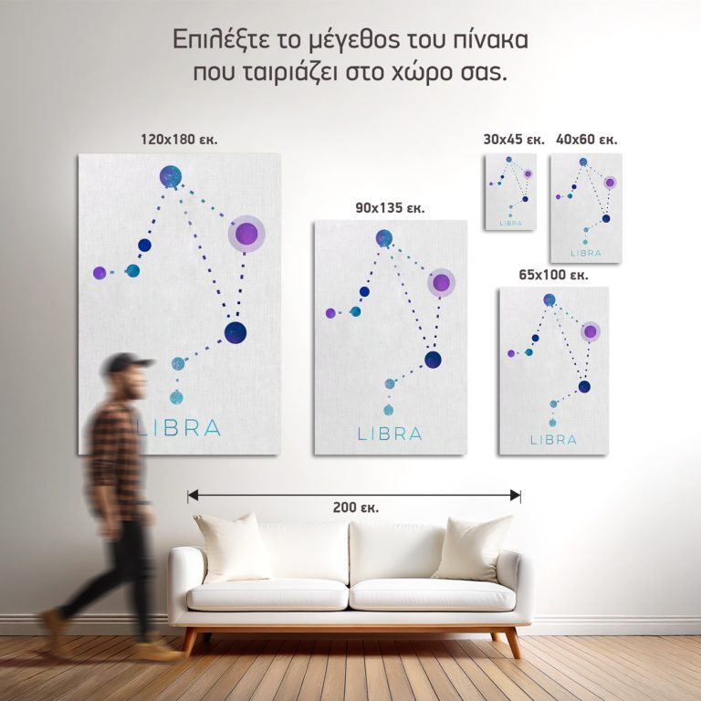 Η σύνθεση προσεγγίζει το Ζυγό ως σύμβολο αρμονίας και λεπτής αισθητικής. Οι κύκλοι-αστέρια λειτουργούν σαν κόμβοι ισορροπίας, ενώ οι διακεκομμένες γραμμές προσδίδουν μουσικό ρυθμό στη φόρμα. Η μετάβαση από τιρκουάζ σε μοβ δημιουργεί ένα οπτικό τόξο που ισορροπεί ψυχρότητα και τρυφερότητα χαρακτηριστικά της διπλής φύσης του ζωδίου. Η σύνθεση έχει αέρινη, συμμετρική αίσθηση χωρίς να είναι αυστηρά συμμετρική, κάτι που δίνει ζωντάνια και κίνηση ενώ διατηρεί την αισθητική ομοιορροπία. Ιδανικό για χώρους που θέλουν να επικοινωνούν κομψότητα, ισορροπία και ήρεμη χάρη.