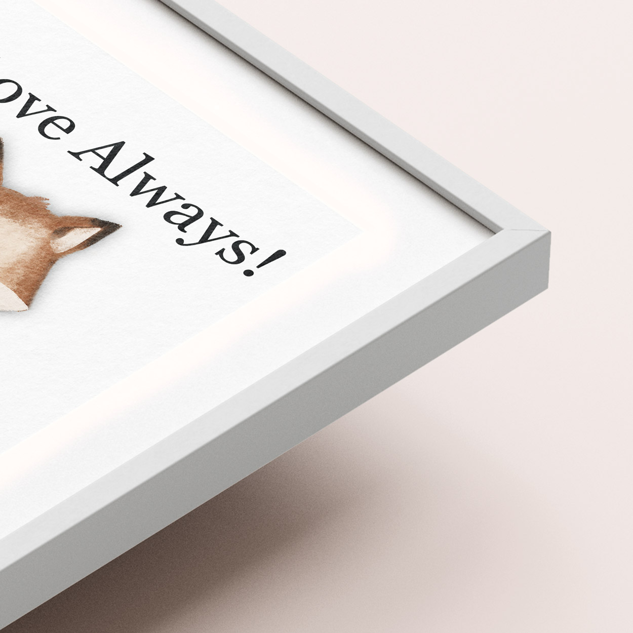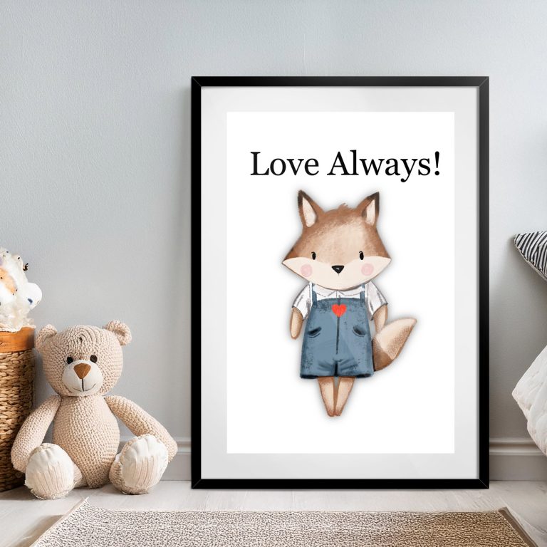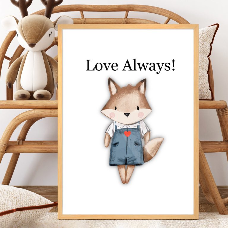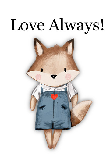 Τρυφερή watercolor αφίσα που απεικονίζει έναν χαριτωμένο μικρό αλεπουδάκι ντυμένο με τζιν σαλοπέτα και λευκό πουκάμισο, με μια κόκκινη καρδούλα στο στήθος. Το μήνυμα "Love Always!" στο πάνω μέρος εκφράζει ανεπιφύλακτη αγάπη και στοργή. Οι απαλοί καφέ τόνοι και η minimalist προσέγγιση δημιουργούν μια ζεστή και αγαπημένη ατμόσφαιρα.