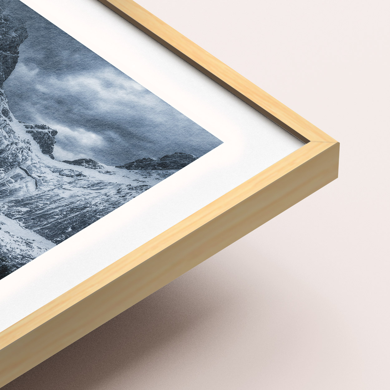Η εκτύπωση γίνεται με eco μελάνια σε χαρτί υψηλής ποιότητας 200gr. με ματ φινίρισμα και η κορνίζα είναι από ξύλο πεύκου και πάχους 17mm x 17mm.