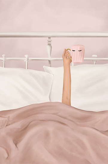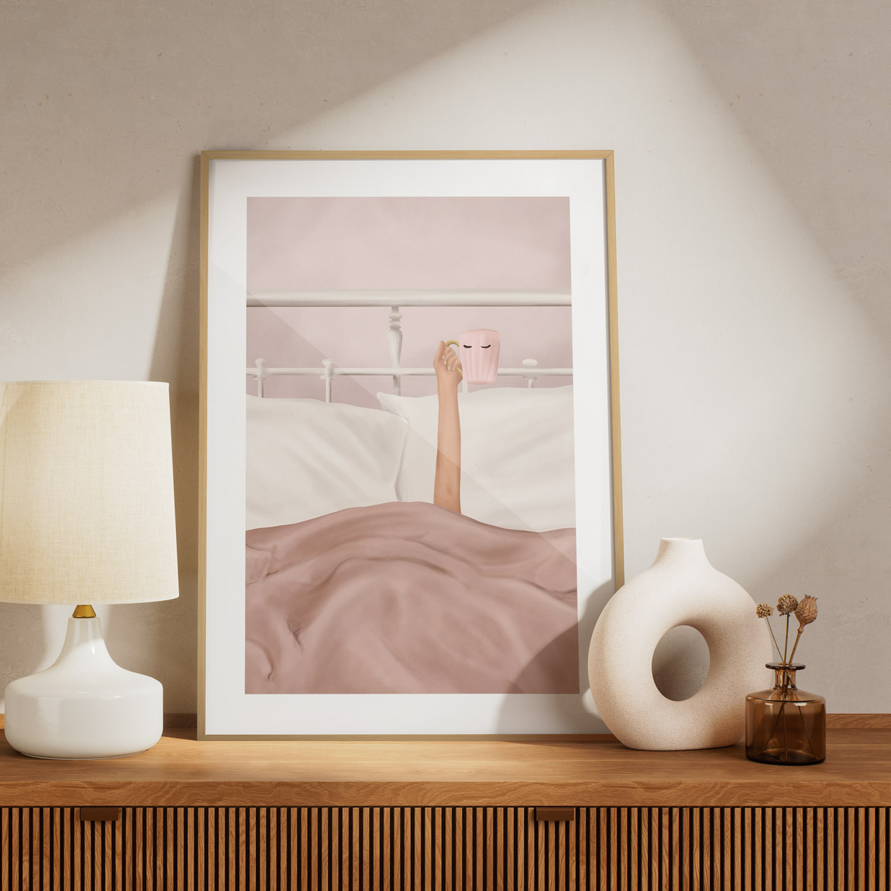 Το Πόστερ – Αφίσα Cozy Bed & Coffee – Decotek 33954 με την εικονογράφηση με το χέρι που κρατά μια κούπα μέσα από τα σκεπάσματα είναι η απόλυτη απεικόνιση ενός “τεμπέλικου” και ερωτικού πρωινού.