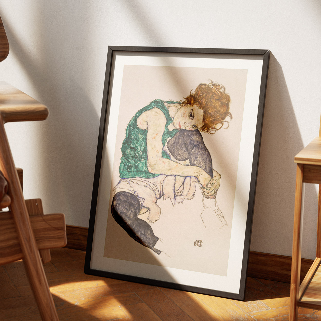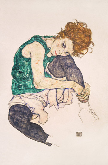 Κλασική αναπαραγωγή έργου του Egon Schiele. Εκφραστική και συγκινητική αναπαραγωγή του διάσημου έργου του Egon Schiele που απεικονίζει μια καθισμένη γυναίκα με κοκκινωπά μαλλιά σε στοχαστική στάση. Η χαρακτηριστική τεχνική του Schiele με τις έντονες γραμμές, τους γήινους τόνους και την ψυχολογική ένταση δημιουργεί ένα βαθιά ανθρώπινο και εκφραστικό πορτρέτο. Οι τόνοι του πράσινου, μωβ και μπεζ προσθέτουν μελαγχολία και ποίηση στη σύνθεση.