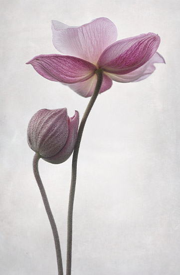 Μια εκλεπτυσμένη φωτογραφία που αποτυπώνει την τρυφερή κομψότητα του λωτού σε όλη του τη δόξα. Το ανθισμένο λουλούδι με τα διάφανα πέταλα σε απαλούς ροζ και μοβ τόνους δεσπόζει δίπλα στο κλειστό μπουμπούκι, δημιουργώντας μια ποιητική σύνθεση ζωής και ανανέωσης. Το καθαρό, ουδέτερο φόντο τονίζει τη φυσική αρχιτεκτονική του λουλουδιού και προσφέρει μια αίσθηση zen ηρεμίας.