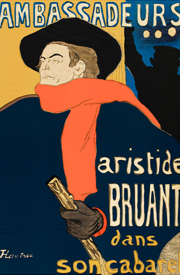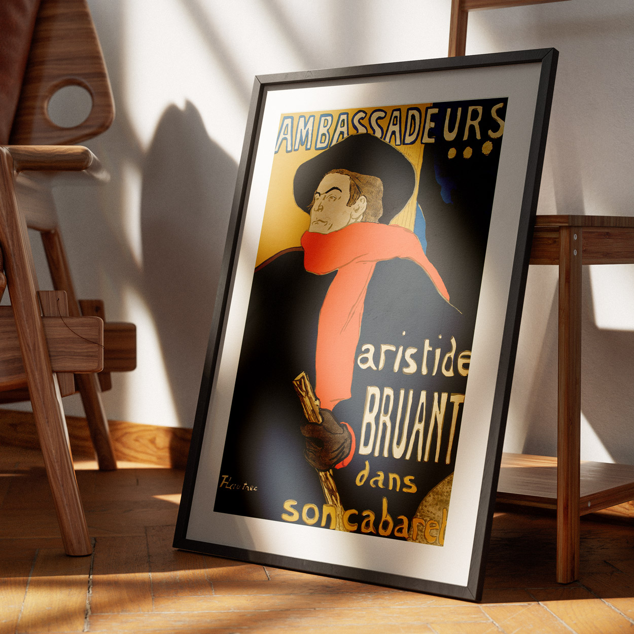 Κλασική αφίσα του Henri de Toulouse-Lautrec για τον καμπαρέ "Ambassadeurs" με τον διάσημο τραγουδιστή Aristide Bruant. Το έργο από τα τέλη του 19ου αιώνα αντιπροσωπεύει τη χρυσή εποχή του Παρισιού.