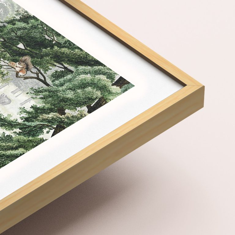 Η εκτύπωση γίνεται με eco μελάνια σε χαρτί υψηλής ποιότητας 200gr. με ματ φινίρισμα και η κορνίζα είναι από ξύλο πεύκου και πάχους 17mm x 17mm.