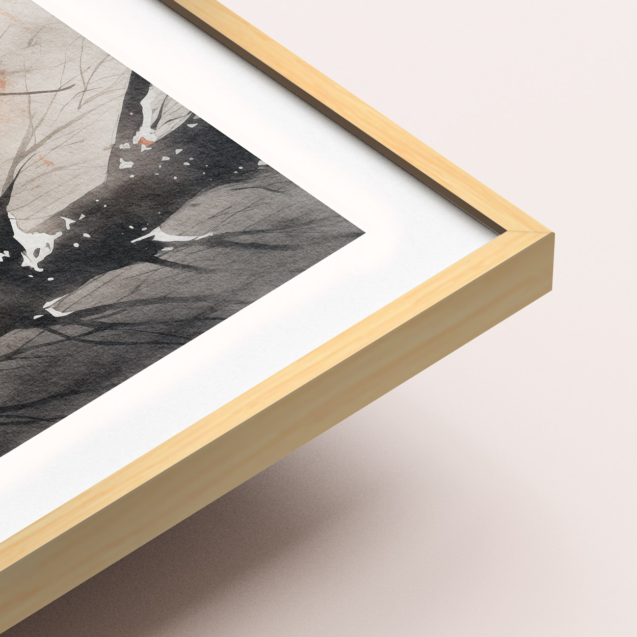 Η εκτύπωση γίνεται με eco μελάνια σε χαρτί υψηλής ποιότητας 200gr. με ματ φινίρισμα και η κορνίζα είναι από ξύλο πεύκου και πάχους 17mm x 17mm.