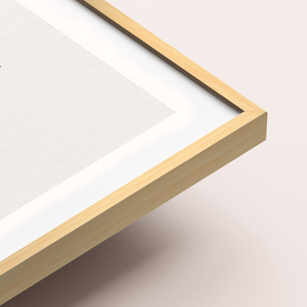Η κάθε διάσταση εκτύπωσης έχει και την δική της διάσταση περιθωρίου (Passpartout). Παρακαλώ ανατρέξτε στον πίνακα που αναγράφονται αναλυτικά οι διαστάσεις, ώστε να επιλέξετε αυτό που σας ταιριάζει καλύτερα. Η κορνίζα που χρησιμοποιούμε είναι από ξύλο πεύκου και πάχους 17mm x 17mm, και μπορείτε να επιλέξετε χρώμα ανάμεσα σε λευκό, μαύρο και χρώμα του ξύλου ανοιχτό.