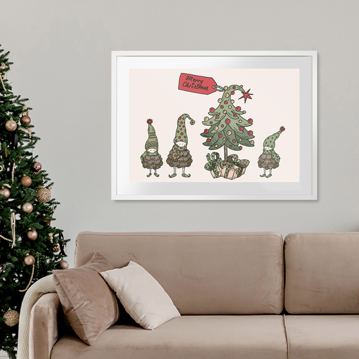 Πόστερ- Αφίσα με ξωτικά και στολισμένο δέντρο, ζεστό και χαριτωμένο με διακοσμημένο χριστουγεννιάτικο δέντρο. Ιδανικό για παιδικά δωμάτια, βιτρίνες και δώρα εποχής.