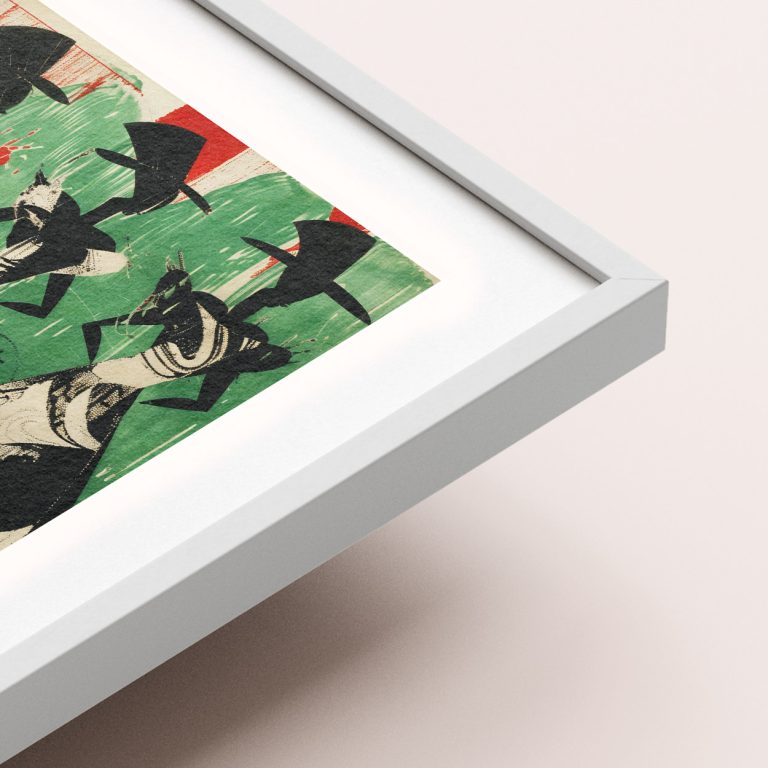 Η εκτύπωση γίνεται με eco μελάνια σε χαρτί υψηλής ποιότητας 200gr. με ματ φινίρισμα και η κορνίζα είναι από ξύλο πεύκου και πάχους 17mm x 17mm.