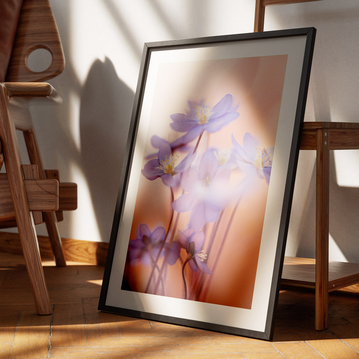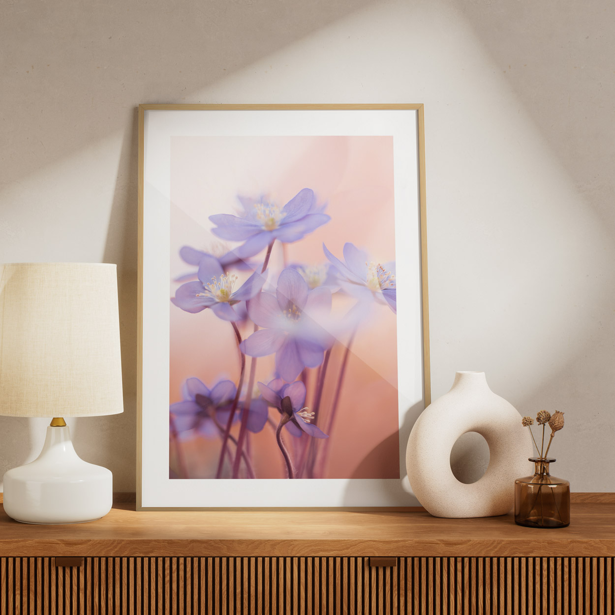 Μια εκπληκτική φωτογραφία που αποτυπώνει την εύθραυστη ομορφιά άγριων λουλουδιών σε απαλούς μοβ τόνους. Το ζεστό, ροζ φόντο και ο απαλός φωτισμός δημιουργούν μια ρομαντική, ονειρική ατμόσφαιρα.