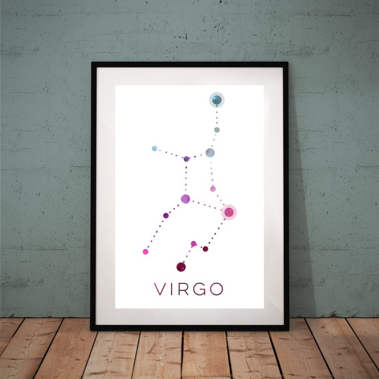 Μοντέρνη αστρολογική απεικόνιση του ζωδίου Παρθένος. Οι κύκλοι σε διαβαθμίσεις τιρκουάζ, μοβ και ροζ συνδέονται με διακεκομμένες γραμμές, σχηματίζοντας τη χαρακτηριστική μορφή της παρθένου στον ουρανό.