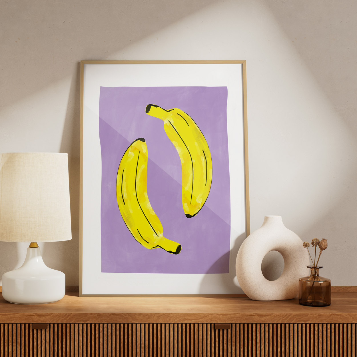 Το Πόστερ – Αφίσα Pop Art με Κίτρινες Μπανάνες – Decotek 33967 με το παστέλ μωβ φόντο δημιουργεί μια τολμηρή αντίθεση, κάνοντας το έργο να ξεχωρίζει με την πρώτη ματιά.