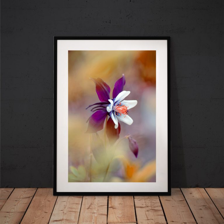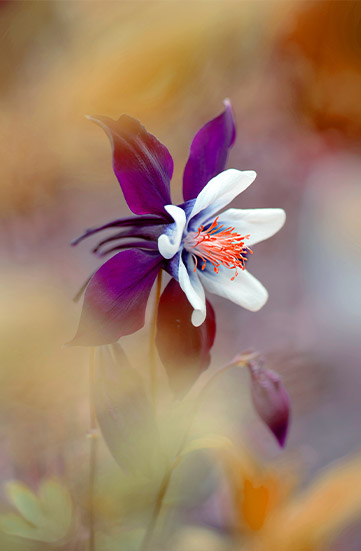 Μια εκπληκτική macro φωτογραφία που αποτυπώνει την εξωτική ομορφιά ενός σπάνιου άνθους. Τα έντονα μοβ πέταλα αντιπαρατίθενται υπέροχα με τα λευκά, ενώ οι πορτοκαλί στήμονες προσθέτουν μια ζεστή πινελιά χρώματος. Το ονειρικό, θολό φόντο σε χρυσαφένιους και ροζ τόνους δημιουργεί μια μαγική ατμόσφαιρα που μεταφέρει σε έναν κόσμο φαντασίας και φυσικής χάρης.