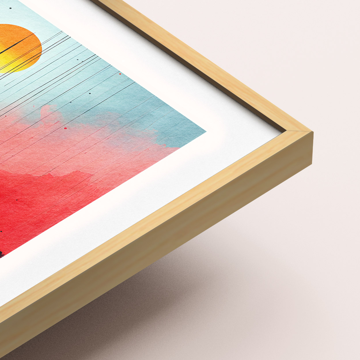 Η εκτύπωση γίνεται με eco μελάνια σε χαρτί υψηλής ποιότητας 200gr. με ματ φινίρισμα και η κορνίζα είναι από ξύλο πεύκου και πάχους 17mm x 17mm.