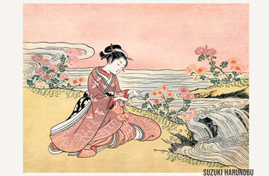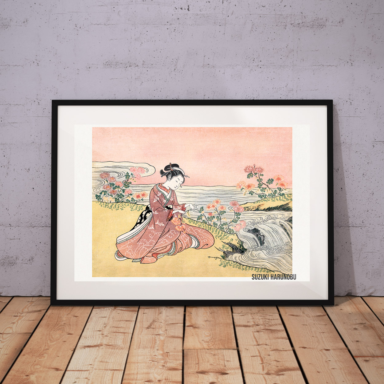 Ένα εξαιρετικό έργο του Suzuki Harunobu (1725-1770), πρωτοπόρου της πολύχρωμης ιαπωνικής ξυλογραφίας. Η σύνθεση απεικονίζει μια κομψή γκέισα σε παραδοσιακό κιμονό με απαλούς ροζ τόνους, καθισμένη δίπλα σε έναν ποταμό με ανθισμένα κεράσια.