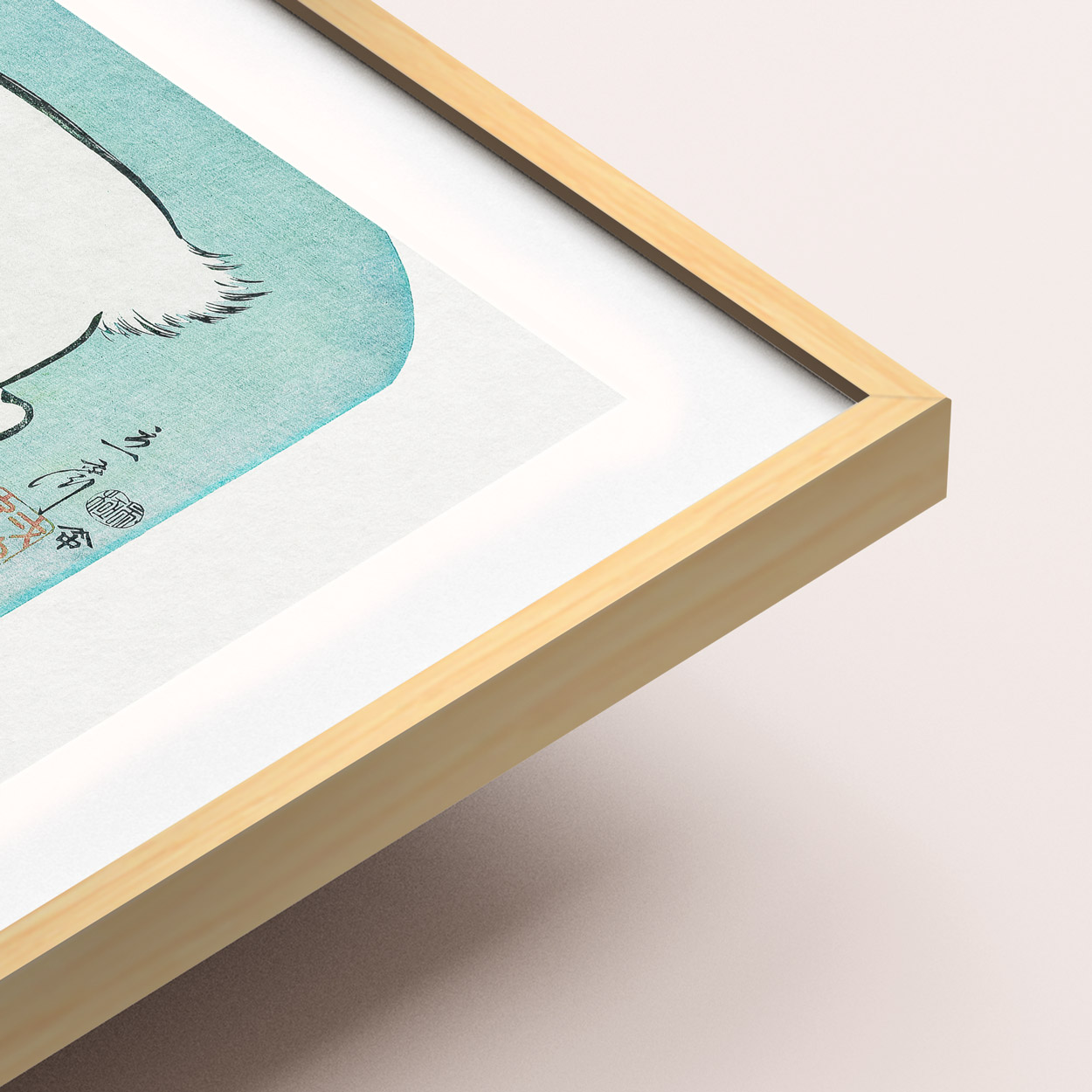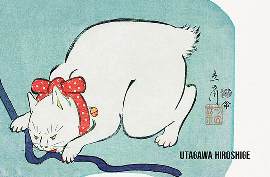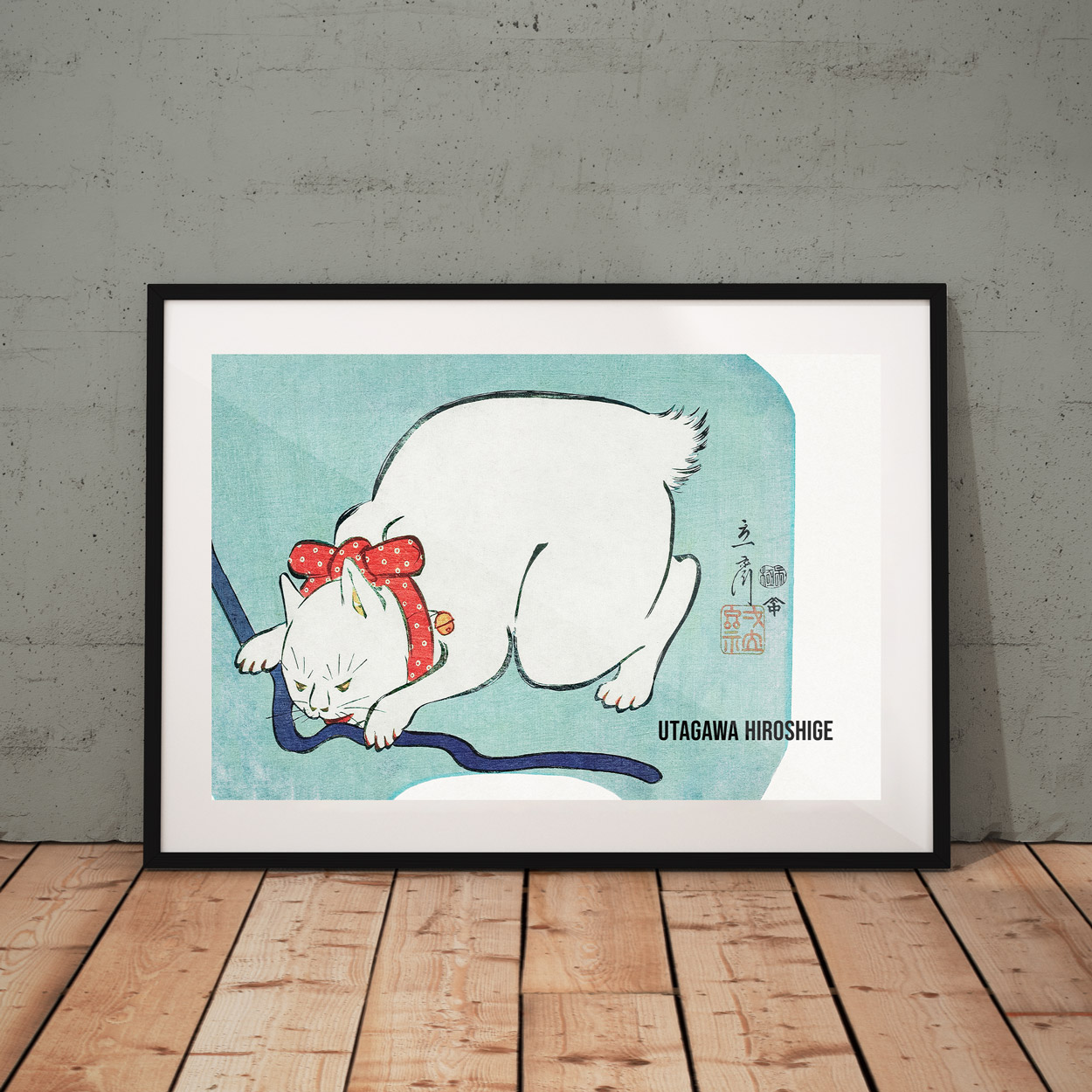 Αυθεντική αναπαραγωγή έργου του διάσημου Ιάπωνα καλλιτέχνη Utagawa Hiroshige που απεικονίζει μια χαριτωμένη λευκή γάτα με κόκκινο φιόγκο να κοιμάται ειρηνικά. Η παραδοσιακή ιαπωνική τεχνική ukiyo-e με τους χαρακτηριστικούς απλούς τόνους λευκό, κόκκινο και τυρκουάζ δημιουργεί μια ήρεμη και γαλήνια ατμόσφαιρα. Η υπογραφή του καλλιτέχνη και τα παραδοσιακά ιαπωνικά στοιχεία προσθέτουν αυθεντικότητα.