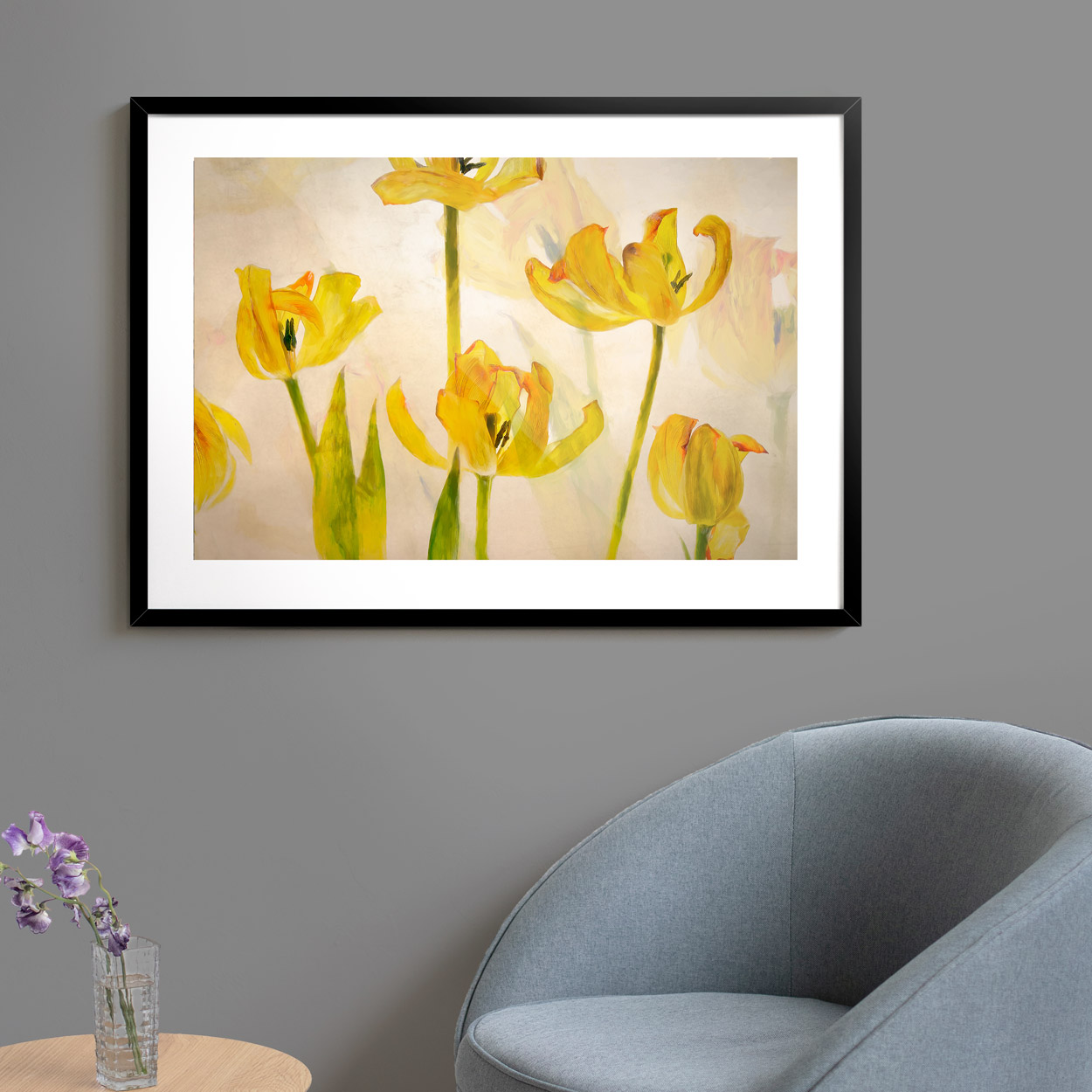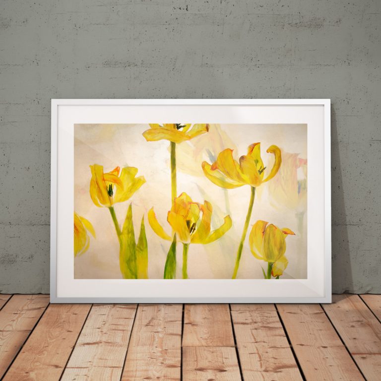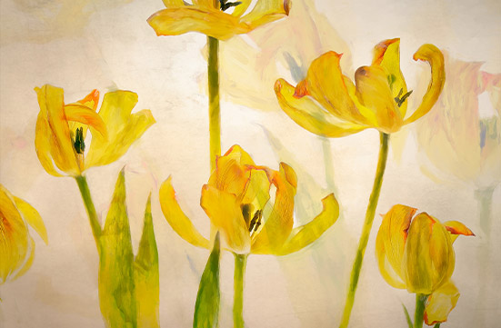 Μια ζωντανή καλλιτεχνική απεικόνιση που παρουσιάζει υπέροχες κίτρινες τουλίπες με ανοιχτά πέταλα σε ζεστούς χρυσούς τόνους. Η impressionistic τεχνική και το απαλό, φωτεινό φόντο δημιουργούν μια αίσθηση κίνησης και ζωντάνιας.