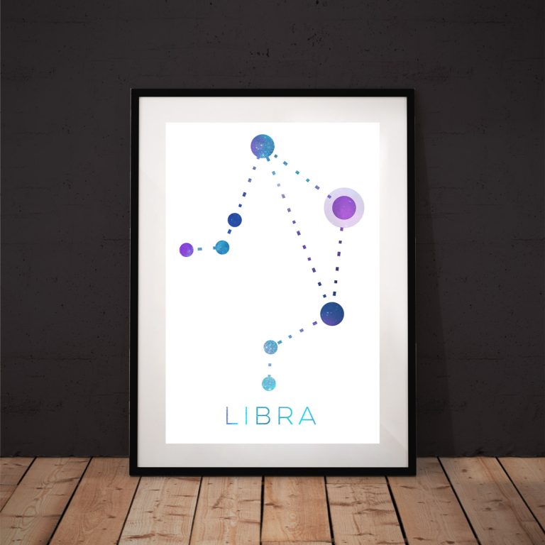 Κομψή minimalist αφίσα που απεικονίζει τον αστερισμό του Ζυγού με σύγχρονο γεωμετρικό design. Οι κύκλοι σε αποχρώσεις μπλε, τιρκουάζ και μοβ συνδέονται με διακεκομμένες γραμμές, σχηματίζοντας τη χαρακτηριστική ισορροπημένη μορφή του ζυγού. Η καθαρή τυπογραφία και το λευκό φόντο αναδεικνύουν την αρμονική και δίκαιη φύση αυτού του αερινού ζωδίου.