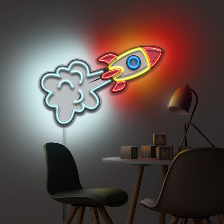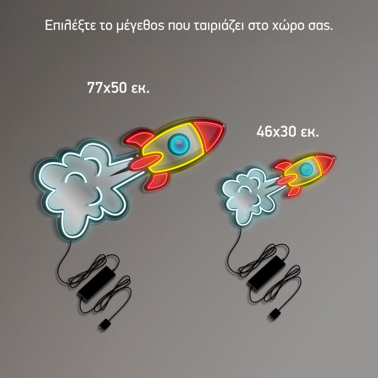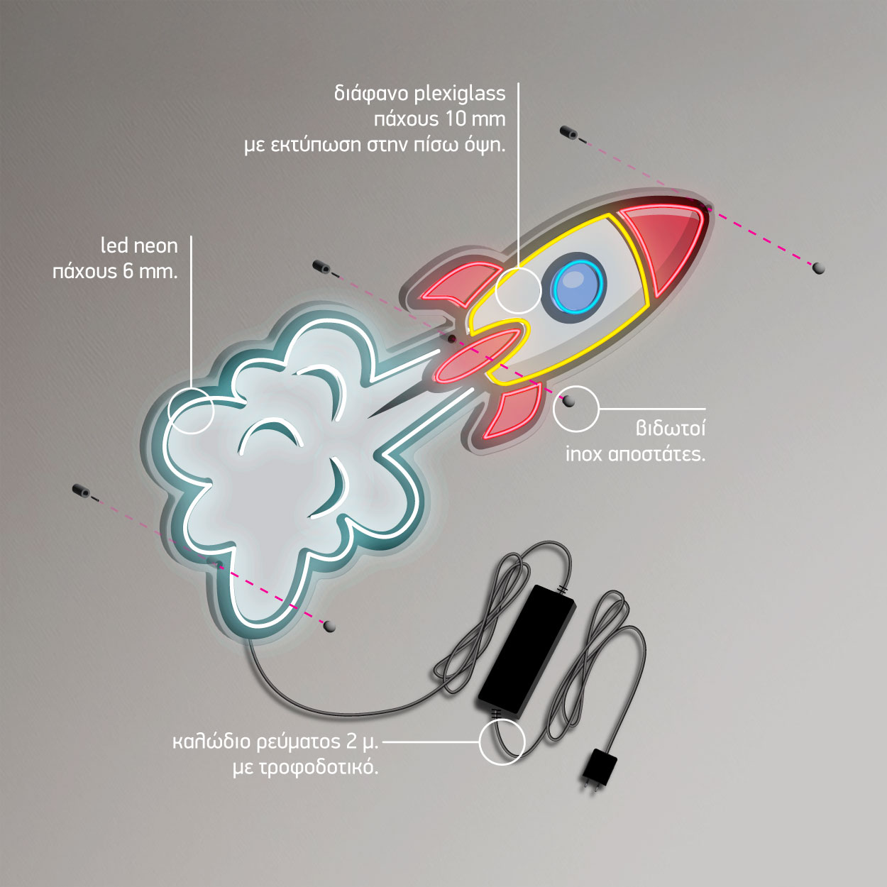 Επιγραφή LED Neon 'Rocket'. Κατασκευασμένη από υψηλής ποιότητας LED neon flex, αυτή η επιγραφή φωτίζει το περιβάλλον σας με ένα ζεστό και φιλόξενο φως που είναι ενεργειακά αποδοτικό και μακράς διάρκειας. Η συσκευασία περιλαμβάνει το πλέξυγκλας πάχους 10 χλστων, εκτυπωμένο βινύλιο στην πίσω όψη, led flex και καλώδιο συνολικού μήκους 2 μέτρων (το τροφοδοτικό είναι μαζί με το καλώδιο). Εάν θέλετε διαφορετικό μήκος καλωδίου σημειώστε το στις παρατηρήσεις κατά την παραγγελία σας. Υπάρχει η δυνατότητα να προσθέσουμε dimmer για την αυξομείωση της φωτεινότητας με επιπλέον χρέωση.