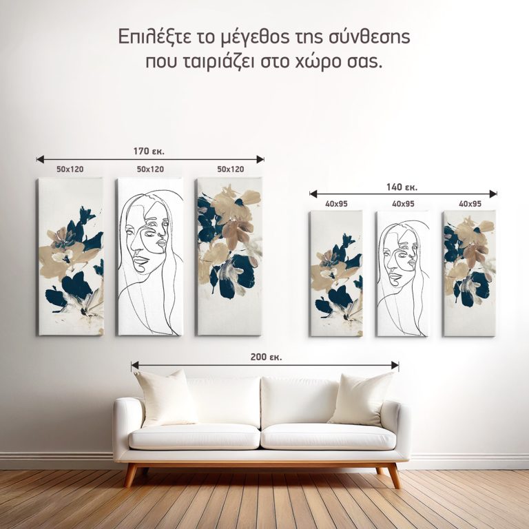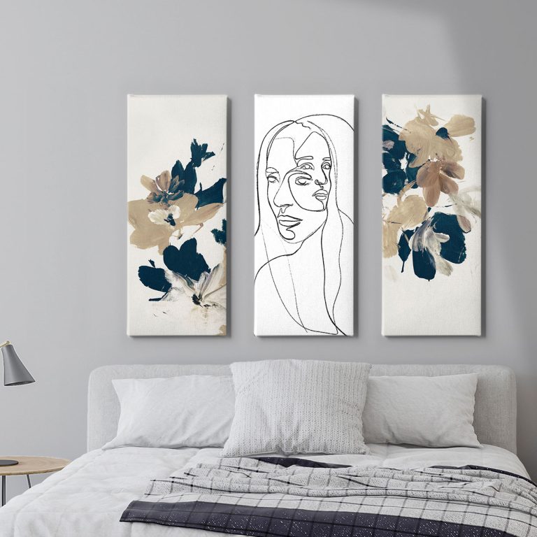 Δώστε μια πινελιά σύγχρονης κομψότητας και πνευματικότητας στο χώρο σας με τη σύνθεση "Ανθισμένη Σκέψη". Αυτό το εντυπωσιακό τρίπτυχο Gallery Set παρουσιάζει ένα κεντρικό, minimal πορτρέτο δύο προσώπων σε συνεχή γραμμή, πλαισιωμένο από δύο αφαιρετικές floral συνθέσεις σε τόνους του βαθύ μπλε και του χρυσού-μπεζ. Η αντίθεση του καθαρού λευκού φόντου με τις δυναμικές πινελιές δημιουργεί μια αίσθηση ηρεμίας και καλλιτεχνικής ισορροπίας, καθιστώντας το την ιδανική επιλογή για πάνω από το κρεβάτι ή έναν κεντρικό τοίχο στο σαλόνι.