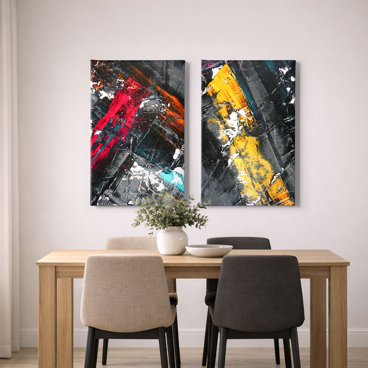 Δώστε μια αίσθηση δύναμης και σύγχρονης τέχνης στον χώρο σας με τη σύνθεση "Ενεργειακές Τροχιές". Αυτό το επιβλητικό δίπτυχο αφηρημένης τέχνης χαρακτηρίζεται από τον δυναμισμό των χρωμάτων, με κυρίαρχο το φλογερό κόκκινο, το λαμπερό κίτρινο και το τυρκουάζ, που "σπάνε" το βαθύ ανθρακί φόντο. Οι έντονες, σχεδόν τρισδιάστατες πινελιές δημιουργούν ένα οπτικό αποτέλεσμα που μαγνητίζει το βλέμμα, καθιστώντας το την ιδανική επιλογή για μια μοντέρνα τραπεζαρία ή έναν επαγγελματικό χώρο που αναζητά ένα statement κομμάτι με χαρακτήρα.