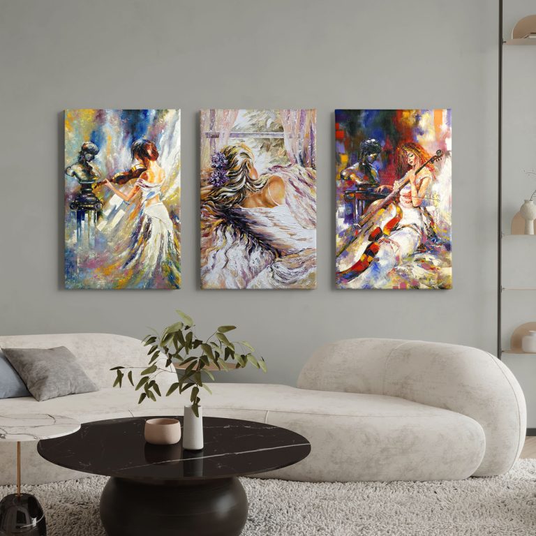 Προσδώστε μια αίσθηση καλλιτεχνικής κίνησης και λυρισμού στο σαλόνι σας με τη σύνθεση "Μελωδικές Αποχρώσεις". Αυτό το επιβλητικό τρίπτυχο απεικονίζει γυναικείες μορφές σε στιγμές απόλυτης συγκέντρωσης και δημιουργίας, παίζοντας βιολί και τσέλο. Η τεχνική των έντονων, ανάγλυφων πινελιών και η πλούσια χρωματική παλέτα —από το λαμπερό κίτρινο και το κόκκινο έως το βαθύ μπλε— θυμίζουν κλασικά έργα ιμπρεσιονισμού, φέρνοντας την ενέργεια της ζωντανής μουσικής απευθείας στον τοίχο σας.