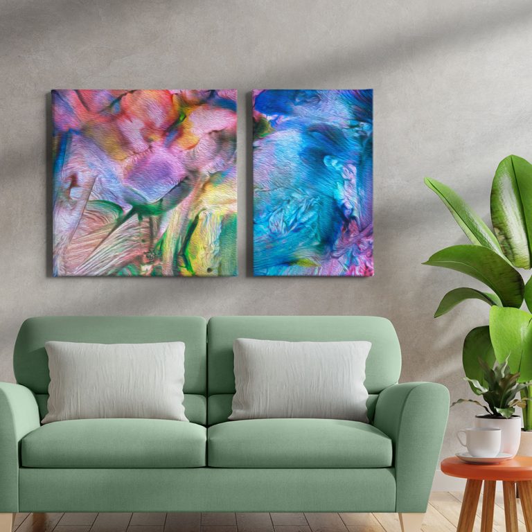 Η σύνθεση "Ονειρικές Αποχρώσεις" είναι μια πανδαισία χρωμάτων που φέρνει κίνηση και δημιουργικότητα στον τοίχο σας. Με κυρίαρχες αποχρώσεις το ροζ, το τυρκουάζ και το πράσινο, αυτό το δίπτυχο προσφέρει μια ονειρική, σχεδόν οργανική αίσθηση. Είναι η ιδανική επιλογή για πάνω από έναν καναπέ σε γήινες ή παστέλ αποχρώσεις, προσφέροντας την απαραίτητη ένταση που χρειάζεται ένας minimal χώρος.