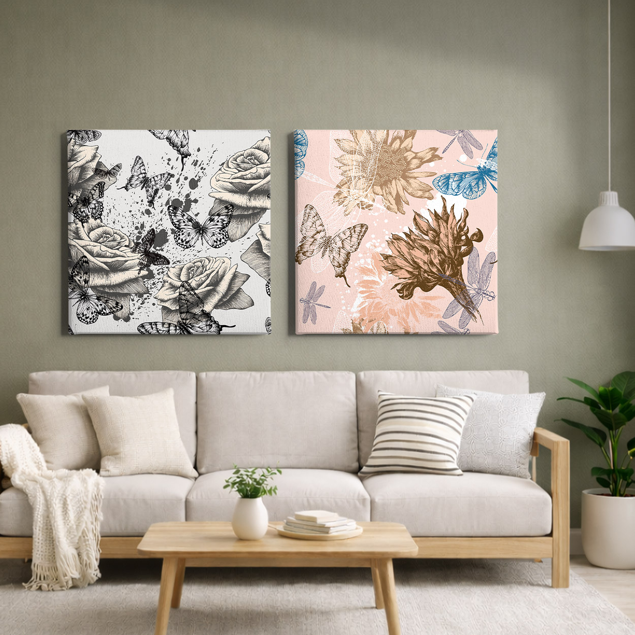Δώστε μια νότα ρομαντισμού και νοσταλγικής κομψότητας στον χώρο σας με τη σύνθεση "Πέταγμα στην Άνοιξη". Αυτό το καλλιτεχνικό δίπτυχο συνδυάζει την κλασική γοητεία των vintage σκίτσων με μια φρέσκια, μοντέρνα χρωματική παλέτα. Ο πρώτος πίνακας παρουσιάζει λεπτομερή τριαντάφυλλα και πεταλούδες σε ασπρόμαυρους τόνους με "πιτσιλιές" μελάνης, ενώ ο δεύτερος φωτίζει τον χώρο με απαλές ροζ και γαλάζιες αποχρώσεις, απεικονίζοντας ανθισμένους ηλίανθους και λιβελούλες. Είναι η ιδανική επιλογή για ένα σαλόνι, μια κρεβατοκάμαρα ή ένα boudoir που αναζητά μια αίσθηση γαλήνης και φυσικής ομορφιάς.