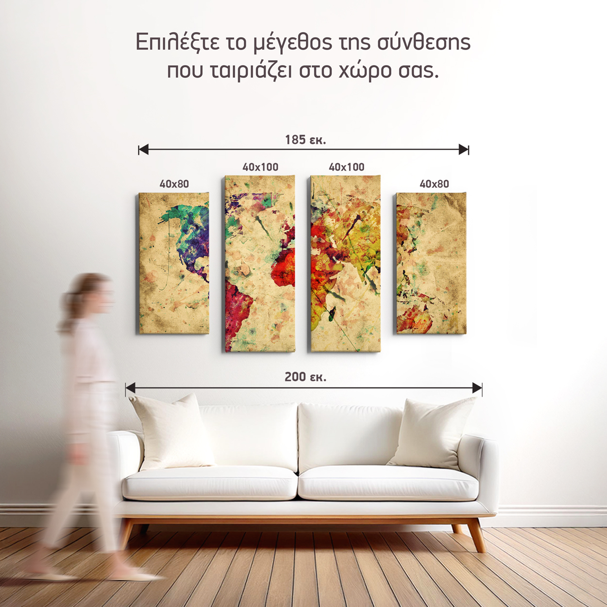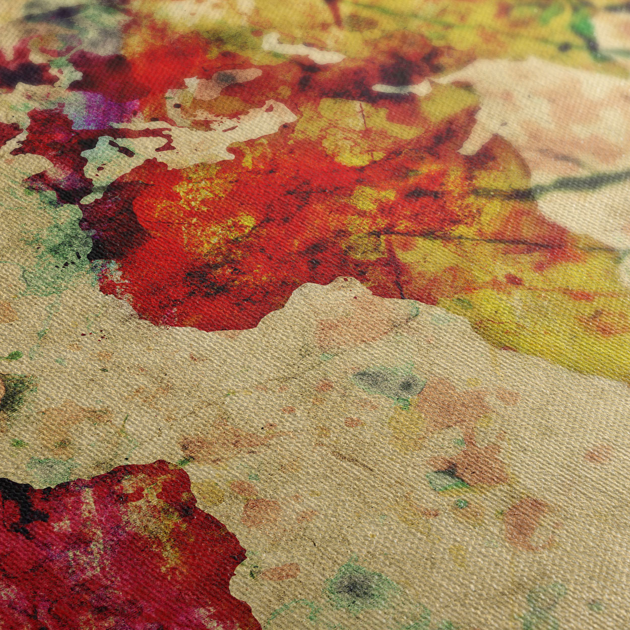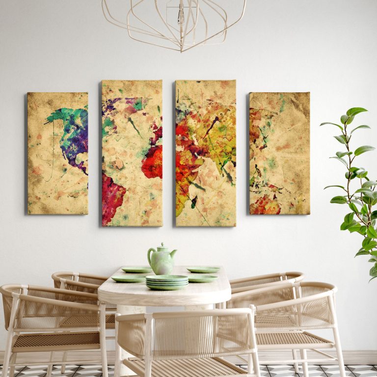 Μια μοντέρνα και καλλιτεχνική ματιά στον κόσμο! Η σύνθεση "Πολύχρωμος Παγκόσμιος Χάρτης" αποτελείται από 4 τεμάχια που συνθέτουν έναν παγκόσμιο χάρτη με την τεχνική της υδατογραφίας (watercolor). Τα ζωηρά χρώματα πάνω στον vintage "λερωμένο" καμβά προσφέρουν μια ευχάριστη αντίθεση, καθιστώντας το κεντρικό σημείο αναφοράς σε μια minimal τραπεζαρία ή έναν φωτεινό επαγγελματικό χώρο.