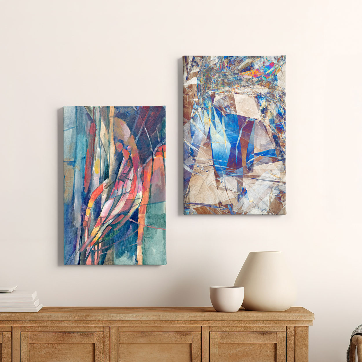 Δώστε ζωντάνια και καλλιτεχνική ένταση στον χώρο σας με τη σύνθεση "Πολυγωνικά Μοτίβα". Αυτό το εντυπωσιακό δίπτυχο αφηρημένης τέχνης χαρακτηρίζεται από την εκρηκτική εναλλαγή ψυχρών και θερμών τόνων, δημιουργώντας μια αίσθηση κίνησης και βάθους. Οι πολυγωνικές μορφές και οι έντονες πινελιές θυμίζουν θραύσματα κρυστάλλου που αντανακλούν το φως, καθιστώντας το την ιδανική επιλογή για να αποτελέσει το κεντρικό σημείο εστίασης σε ένα σύγχρονο σαλόνι ή πάνω από μια minimal κονσόλα.