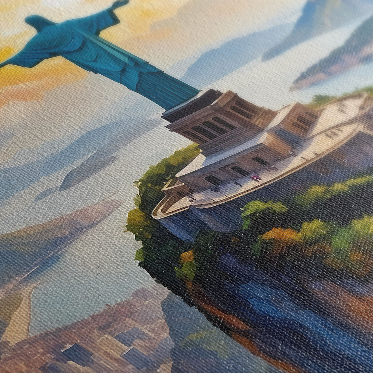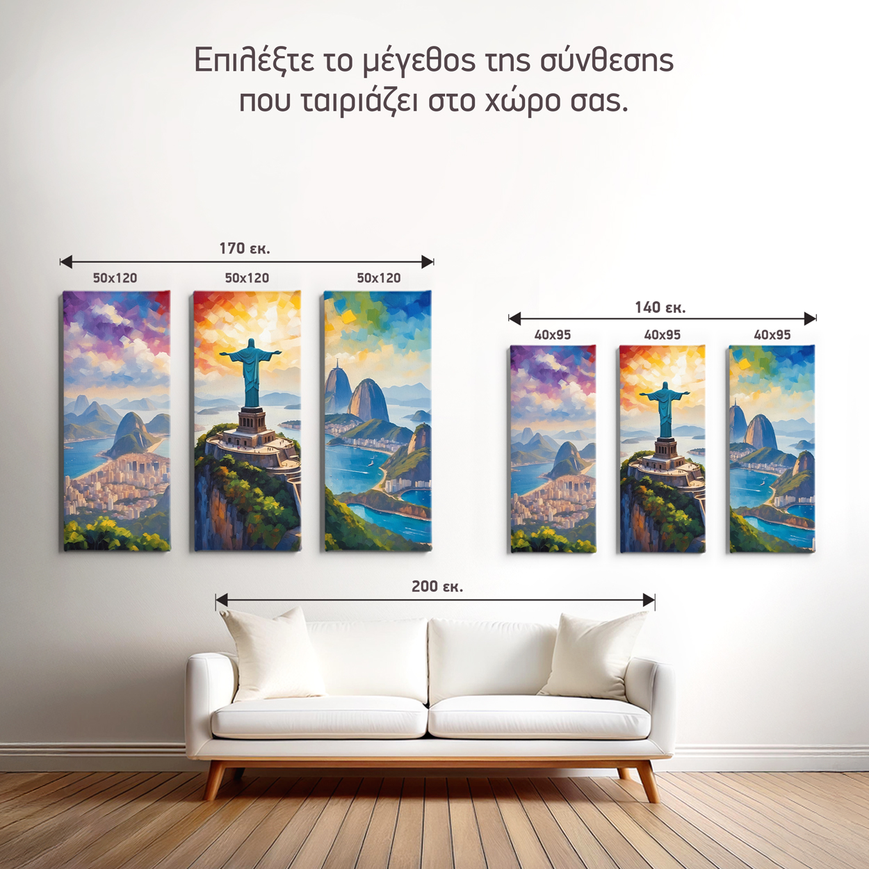 Ταξιδέψτε στην καρδιά της Βραζιλίας με τη σύνθεση "Rio Majesty". Αυτό το επιβλητικό τρίπτυχο αποτυπώνει το παγκοσμίου φήμης άγαλμα του Χριστού Λυτρωτή να δεσπόζει πάνω από τον κόλπο του Ρίο ντε Τζανέιρο, μέσα από μια ζωντανή παλέτα χρωμάτων που θυμίζει σύγχρονη ιμπρεσιονιστική ζωγραφική. Οι έντονες πινελιές και η εναλλαγή των αποχρώσεων του ουρανού από το βαθύ μωβ και το πορτοκαλί του ηλιοβασιλέματος έως το λαμπερό γαλάζιο— δημιουργούν μια εντυπωσιακή ατμόσφαιρα που προσδίδει ζωντάνια και κοσμοπολίτικο αέρα σε κάθε σύγχρονη τραπεζαρία ή σαλόνι.